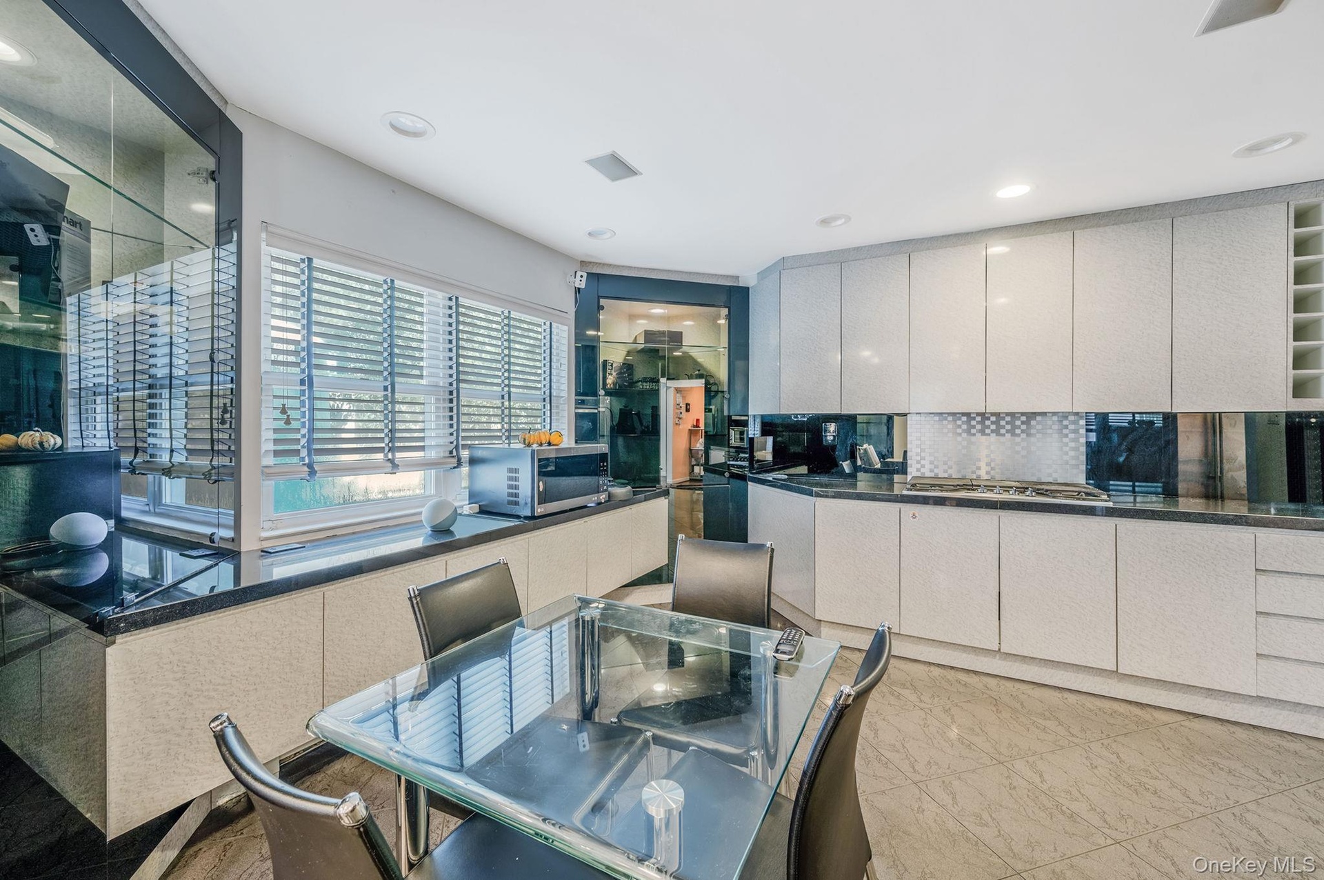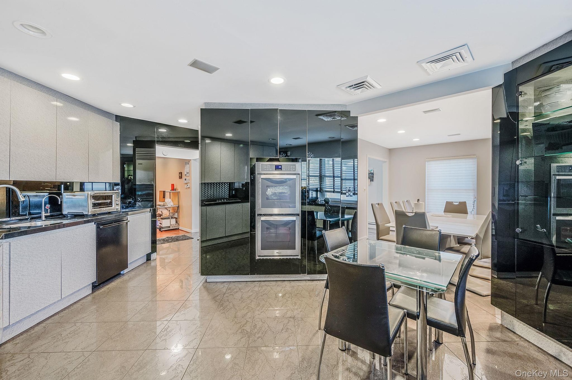 - Kitchen with backsplash, modern cabinets, recessed lighting, and stainless steel appliances