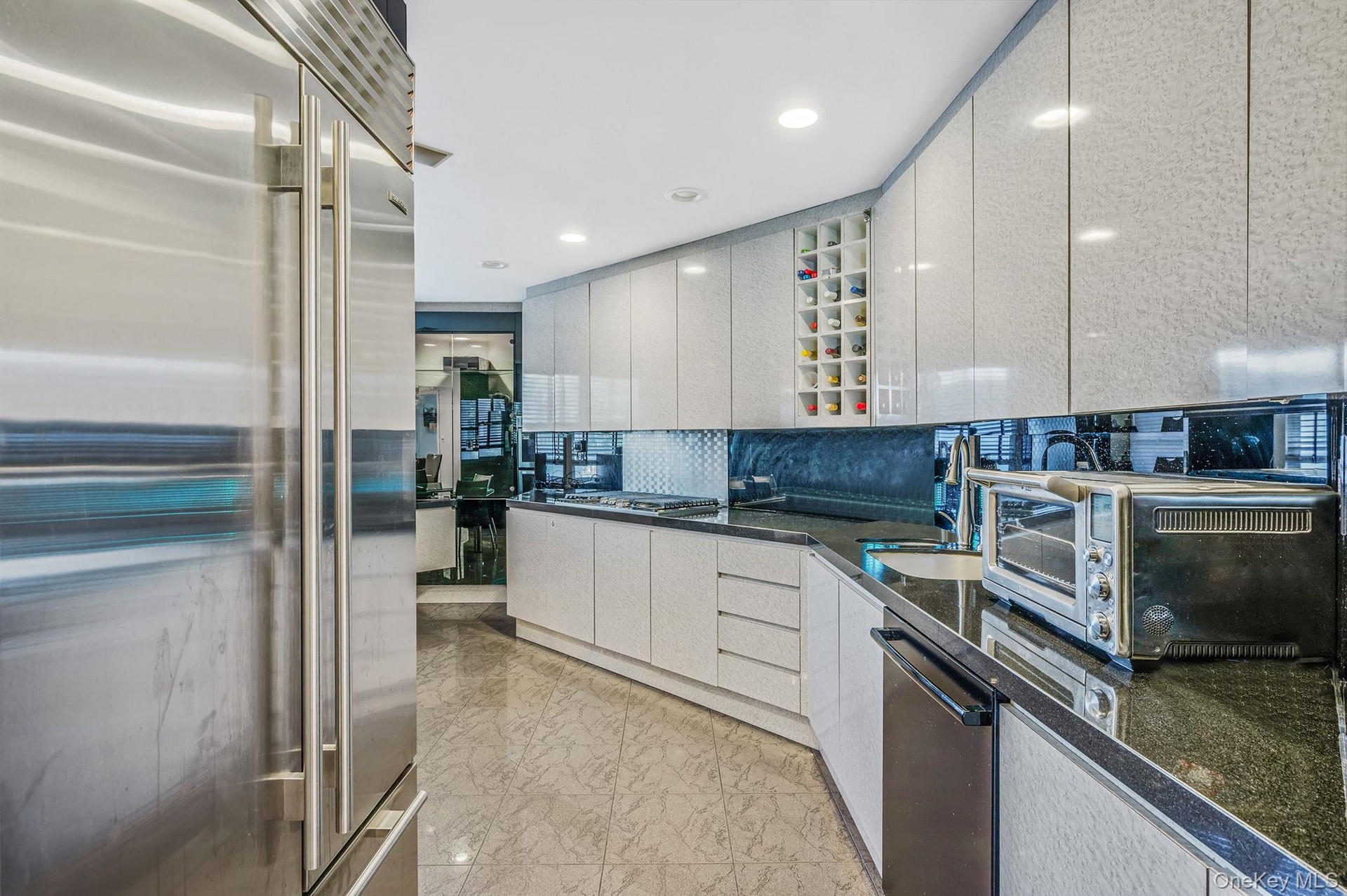 - Kitchen with appliances with stainless steel finishes, tasteful backsplash, modern cabinets, recessed lighting, and dark stone counters