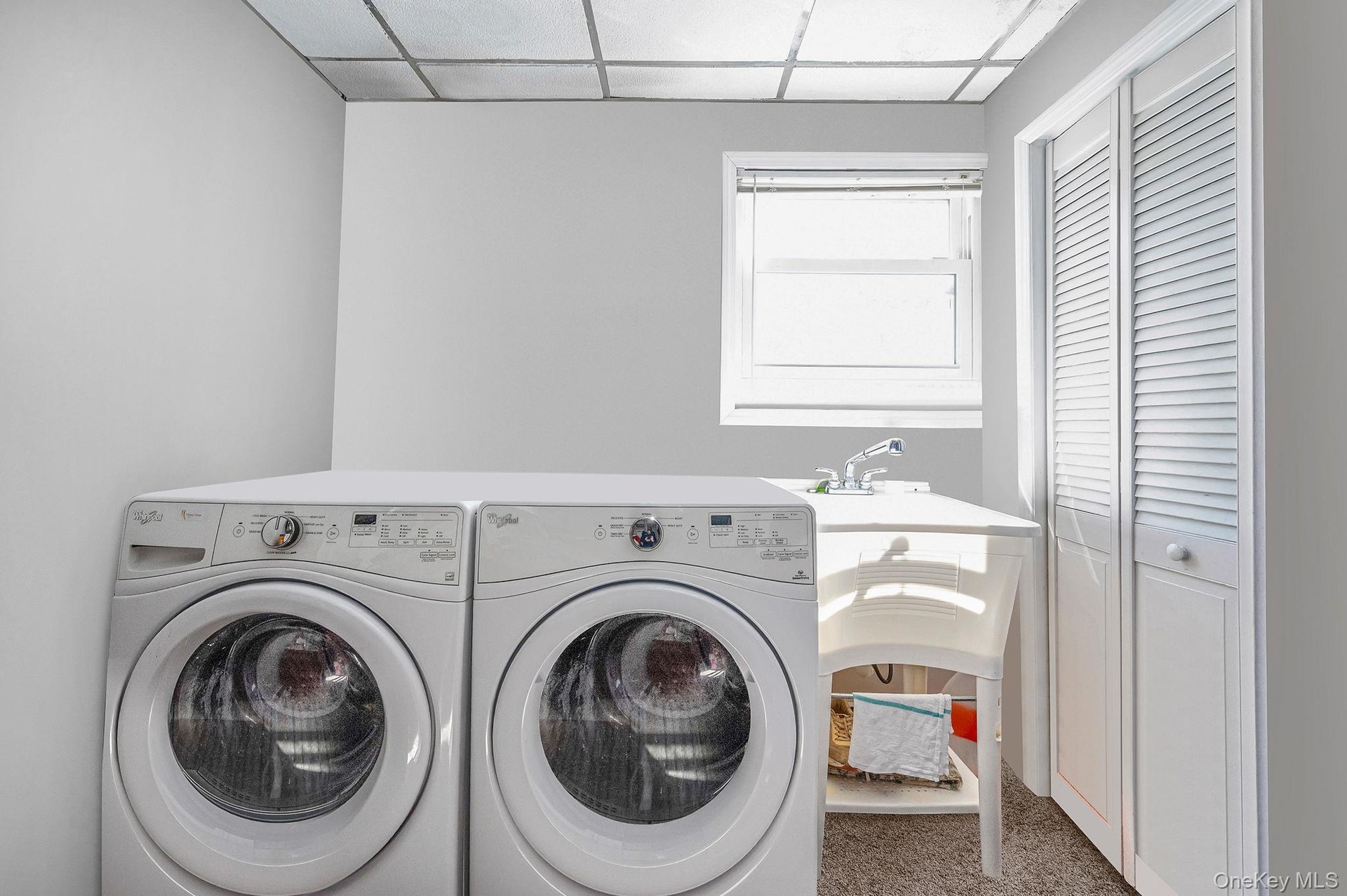 - Laundry room featuring a drop ceiling and washing machine and dryer