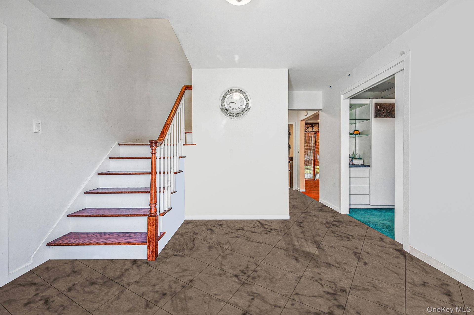 - Entryway with tile patterned flooring, stairs, and baseboard heating