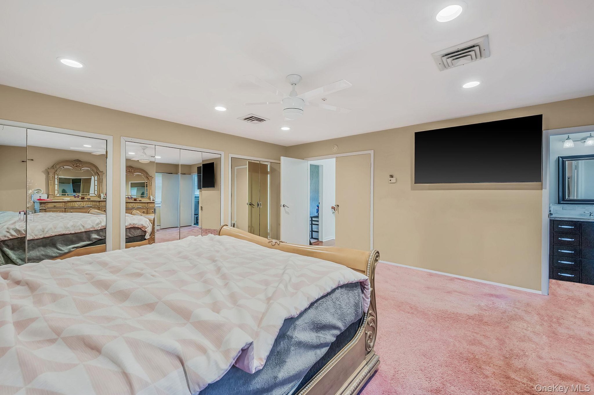 - Carpeted bedroom featuring two closets, ceiling fan, and recessed lighting