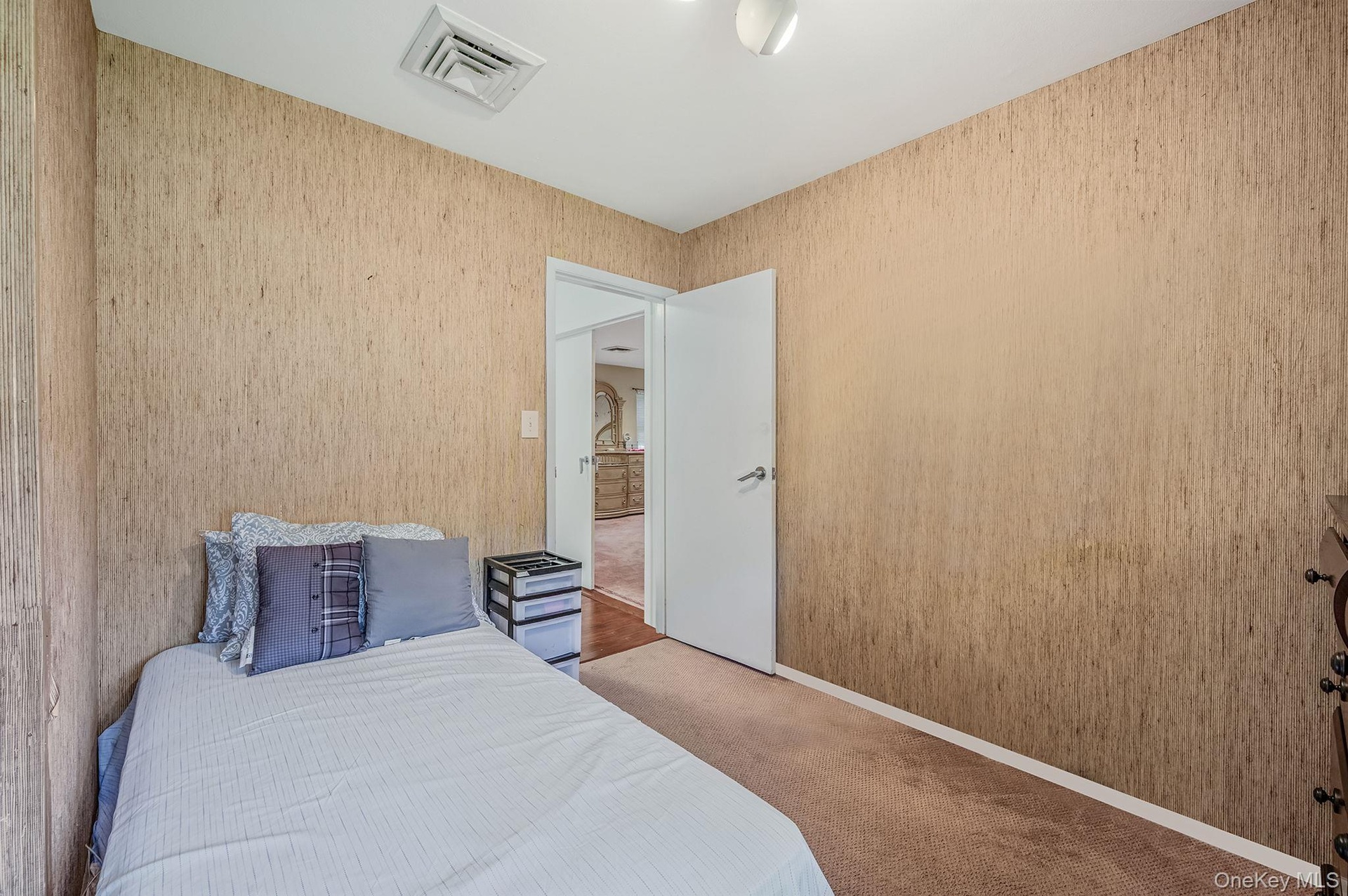 - Carpeted bedroom featuring wallpapered walls and baseboards