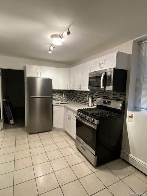 - Kitchen featuring appliances with stainless steel finishes, tasteful backsplash, light tile patterned floors, and white cabinetry