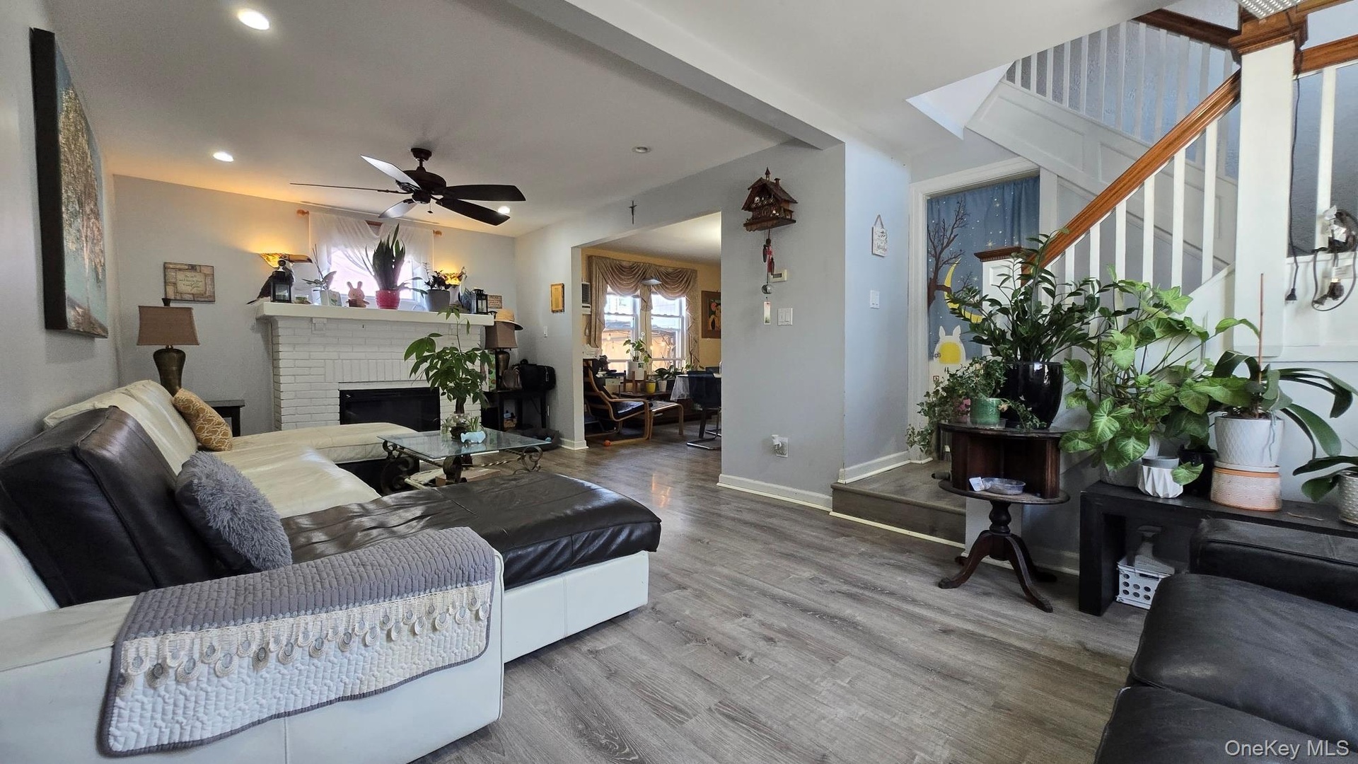 - Living room featuring wood finished floors, a brick fireplace, ceiling fan, recessed lighting, and stairway