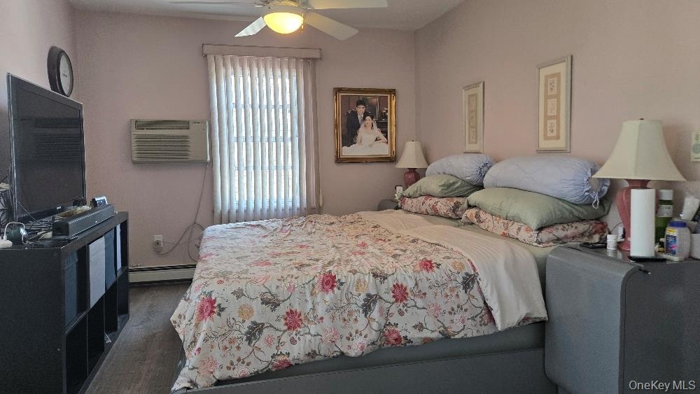 - Bedroom featuring ceiling fan, a baseboard heating unit, a wall mounted air conditioner, and dark wood-type flooring