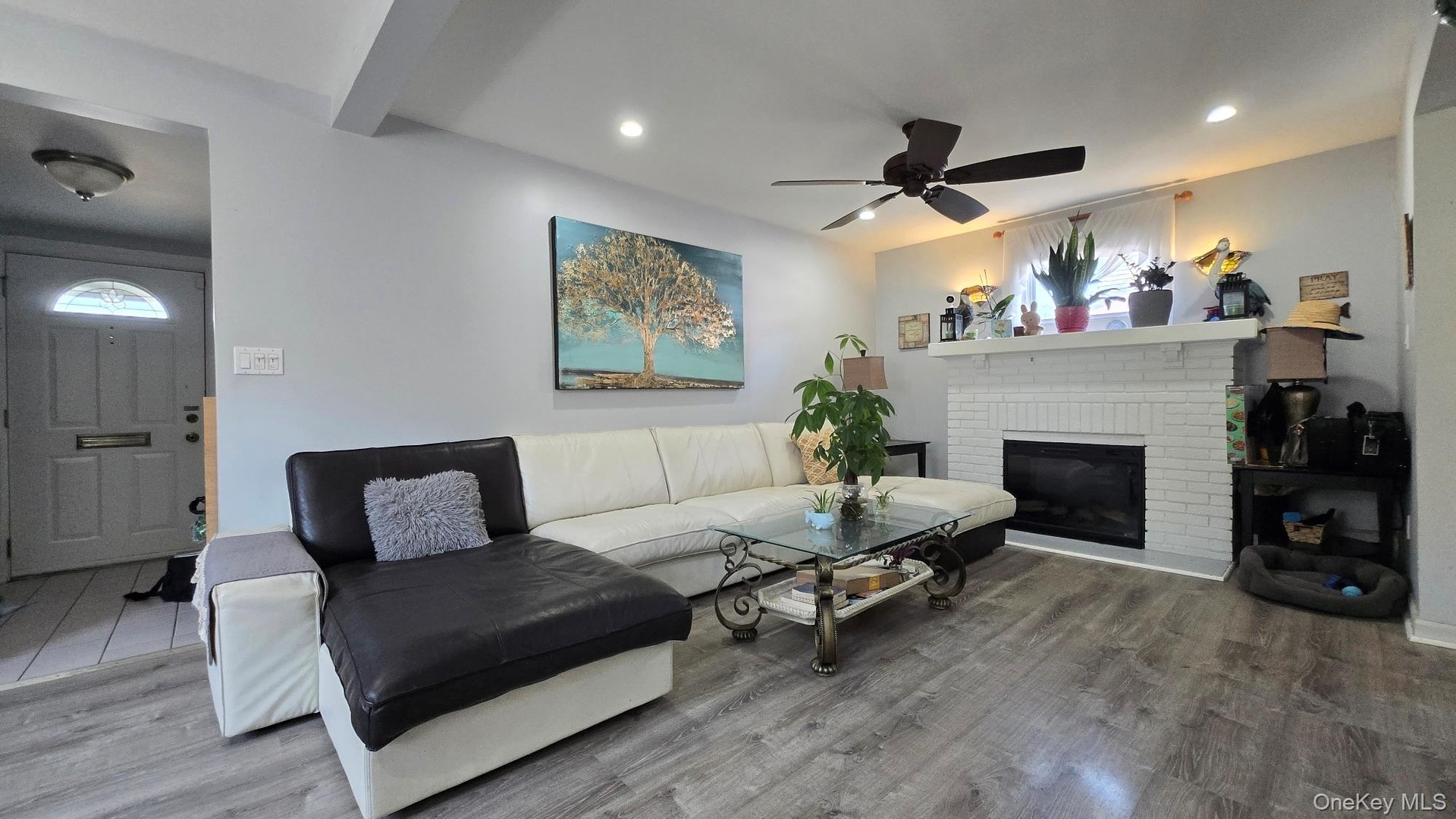 - Living area featuring wood finished floors, a fireplace, ceiling fan, and recessed lighting