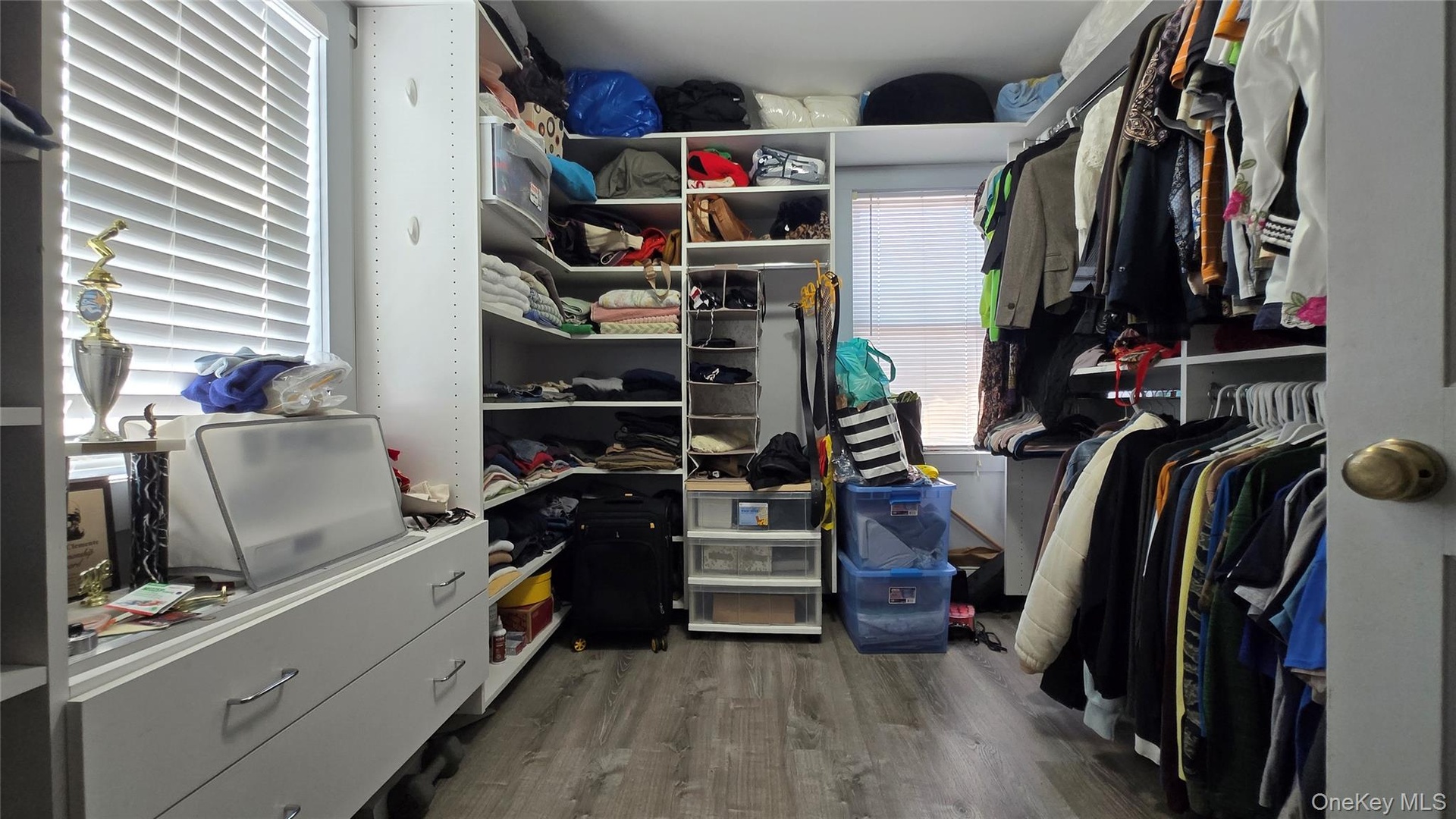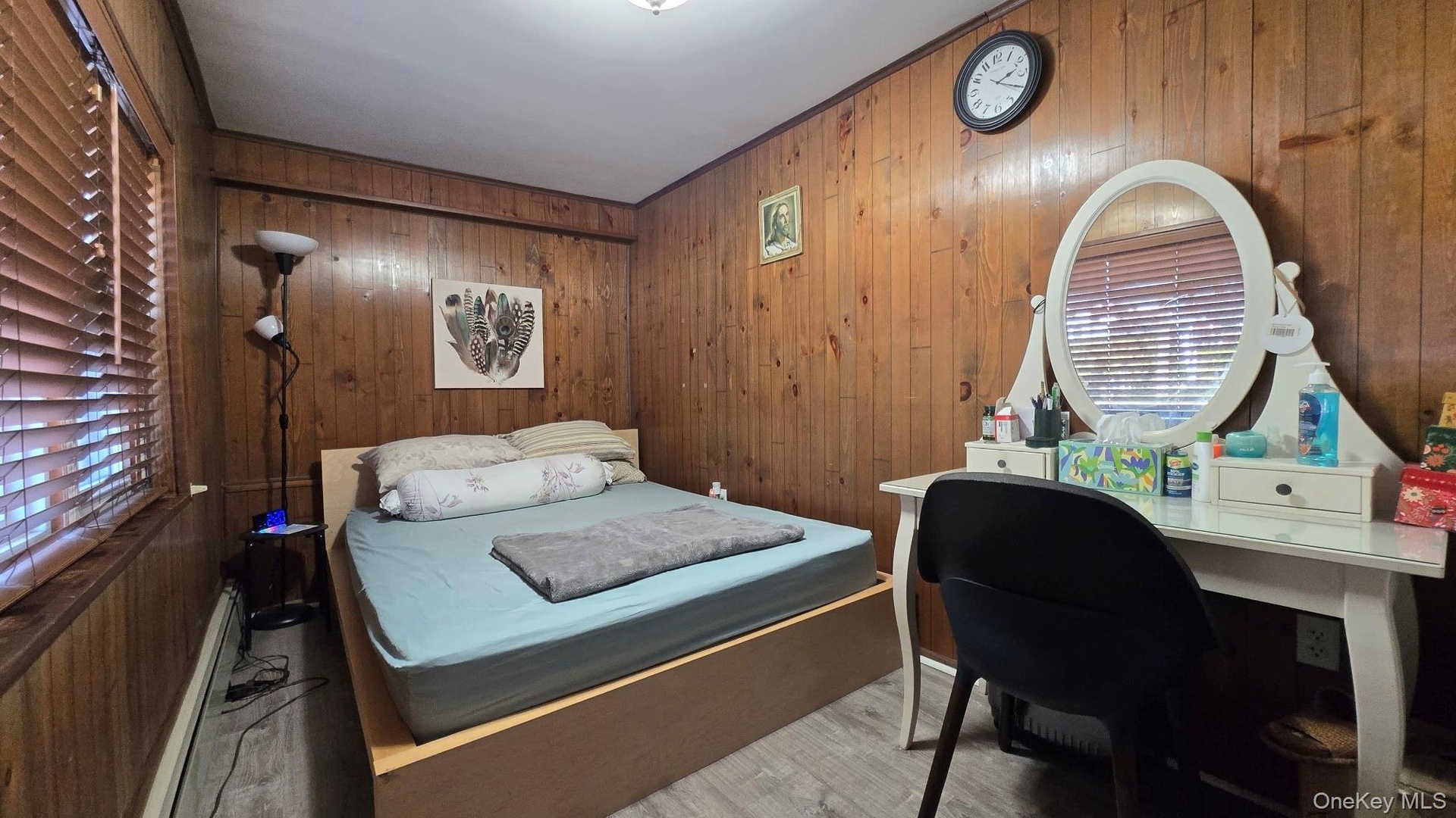 - Bedroom featuring a closet, wood finished floors, and a baseboard radiator