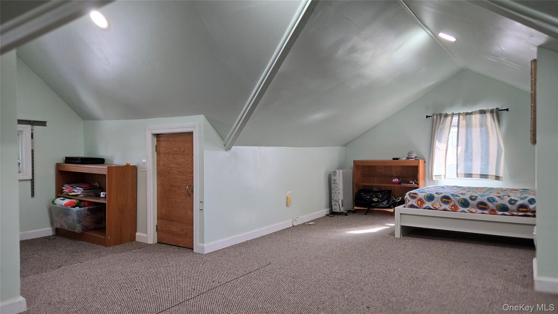 - Bedroom featuring vaulted ceiling and carpet flooring
