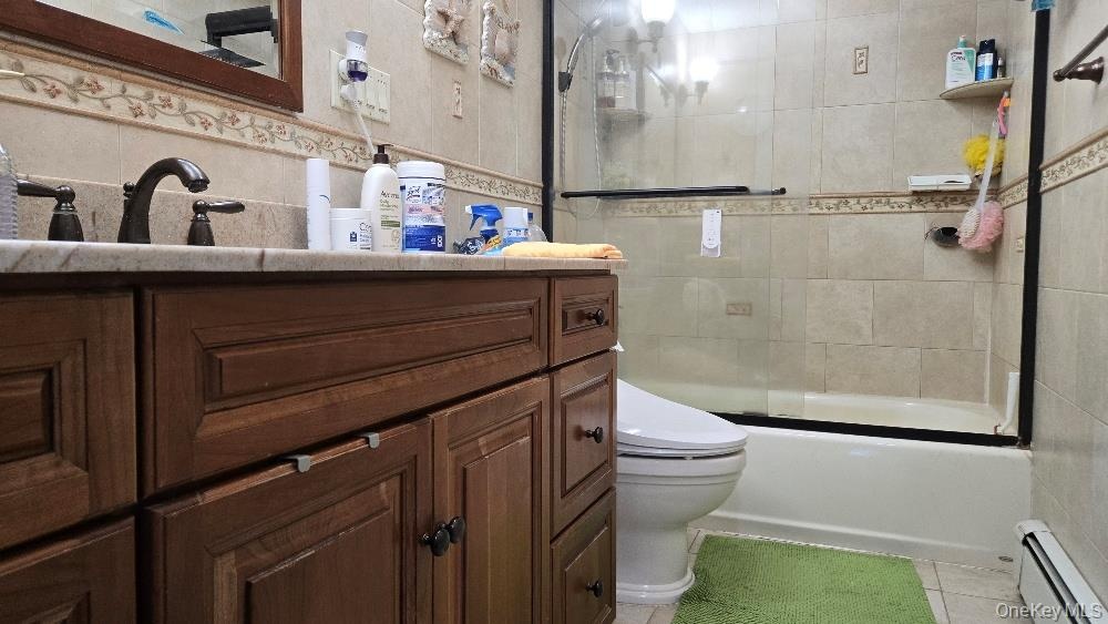 - Full bath featuring a baseboard heating unit, enclosed tub / shower combo, vanity, and light tile patterned flooring