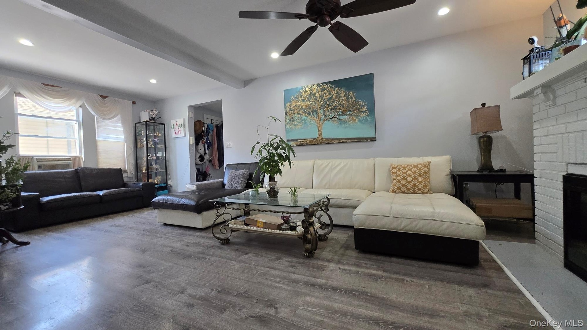 - Living room with a brick fireplace, wood finished floors, beamed ceiling, a ceiling fan, and recessed lighting