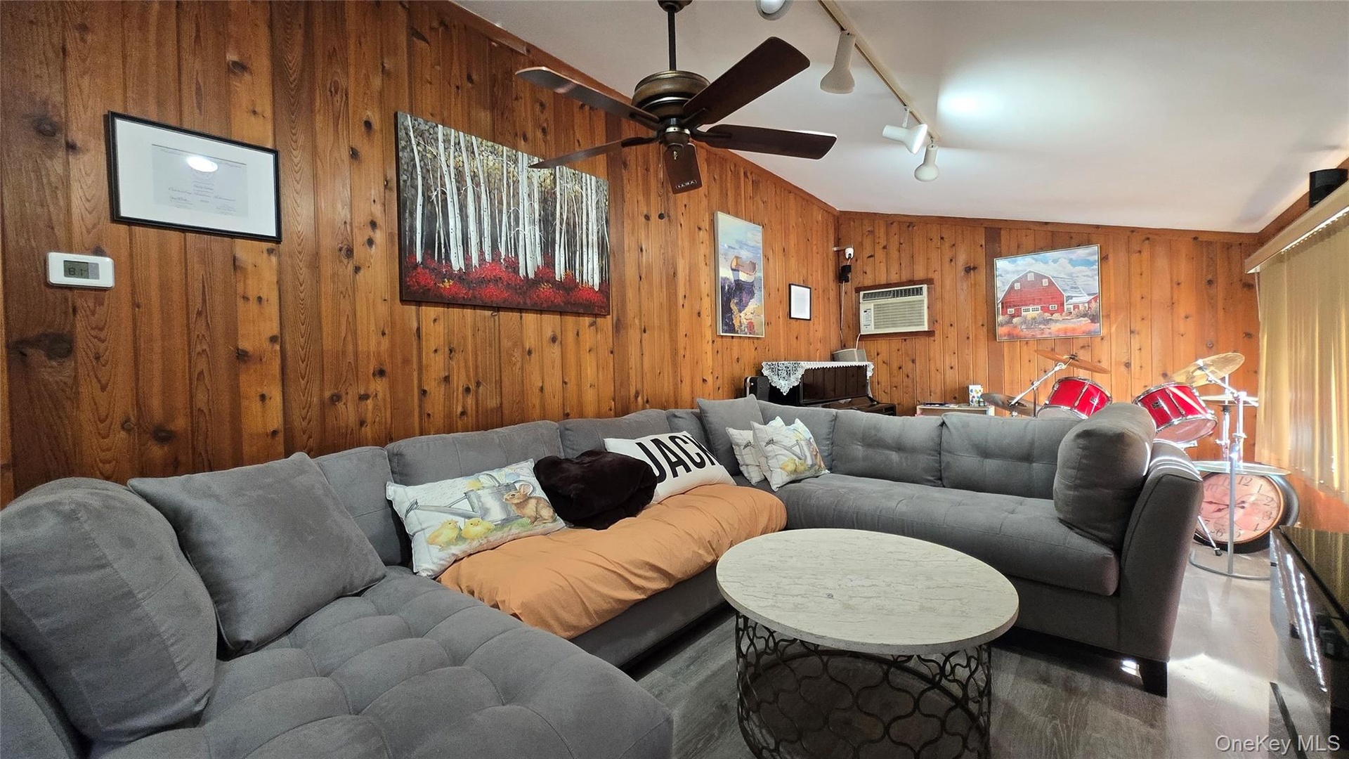 - Living room with rail lighting, wooden walls, lofted ceiling, a wall unit AC, and a ceiling fan