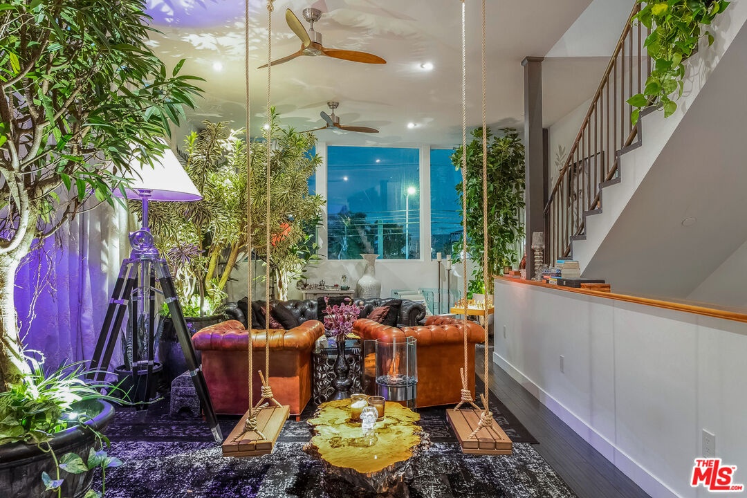 "The Venice Art House", a James Bond architectural fully gated property with rare LAC2 zoning and two addresses in the heart of Venice. Between Abbott Kinney Boulevard and Lincoln, this compound is fully secured and private. The property features 3 beds and 3 full baths, with a rooftop outdoor shower, spa, infrared sauna, and custom sound. 11ft ceilings in the LR on the 2nd floor reach to 14ft in the open-concept kitchen with a stone bar, gigantic double-paned glass windows in the LR to limit sound, and ceiling to floor elegant custom drapes in the LR and BR. Black hardwood floors throughout, adorned with Timothy Oulton furniture set with vintage appointments, Miele appliances, thick steel beams, and elgantly bent iron railings. The first level features a 4-car garage, and a separate open studio space with its own entry and gate, polished concrete floors, rainfall shower, and it's own AC, kitchenette and washer/dryer. The house was built with sought after durability, including images of the build, and full blueprints. The spacious master bedroom offers British design, a beautiful custom walk-in closet, custom blackout drapes and curtains, and a private balcony. A spiral staircase above the kitchen leads to a library-movie room with four skylights, including one in the upper bathroom with full shower. A separate staircase from the LR leads to the rooftop deck featuring custom finished teak wood, lush California succulents and panoramic views from the palm tress in MDR to the hills above Sunset. Sun or work in privacy between the spa, fireplace and outdoor shower while listening to orchestra music above the city. The revenue from the separate studio and media area can be retained, currently ranging from $4,000-6,000/mo, or the entire main house can be leased for an additional projected $14,000-$15,000/mo or on VRBO and other platforms for more. With incredible versatility with LAC2 zoning, the entire three story property could also be transformed into a restaurant, lounge, gym, retreat spa, or media studio with remarkable possibilities. This is one of the rarest gems in all of Venice, offering a unique blend of privacy and security while allowing you to fully enjoy life in the heart of Venice.
