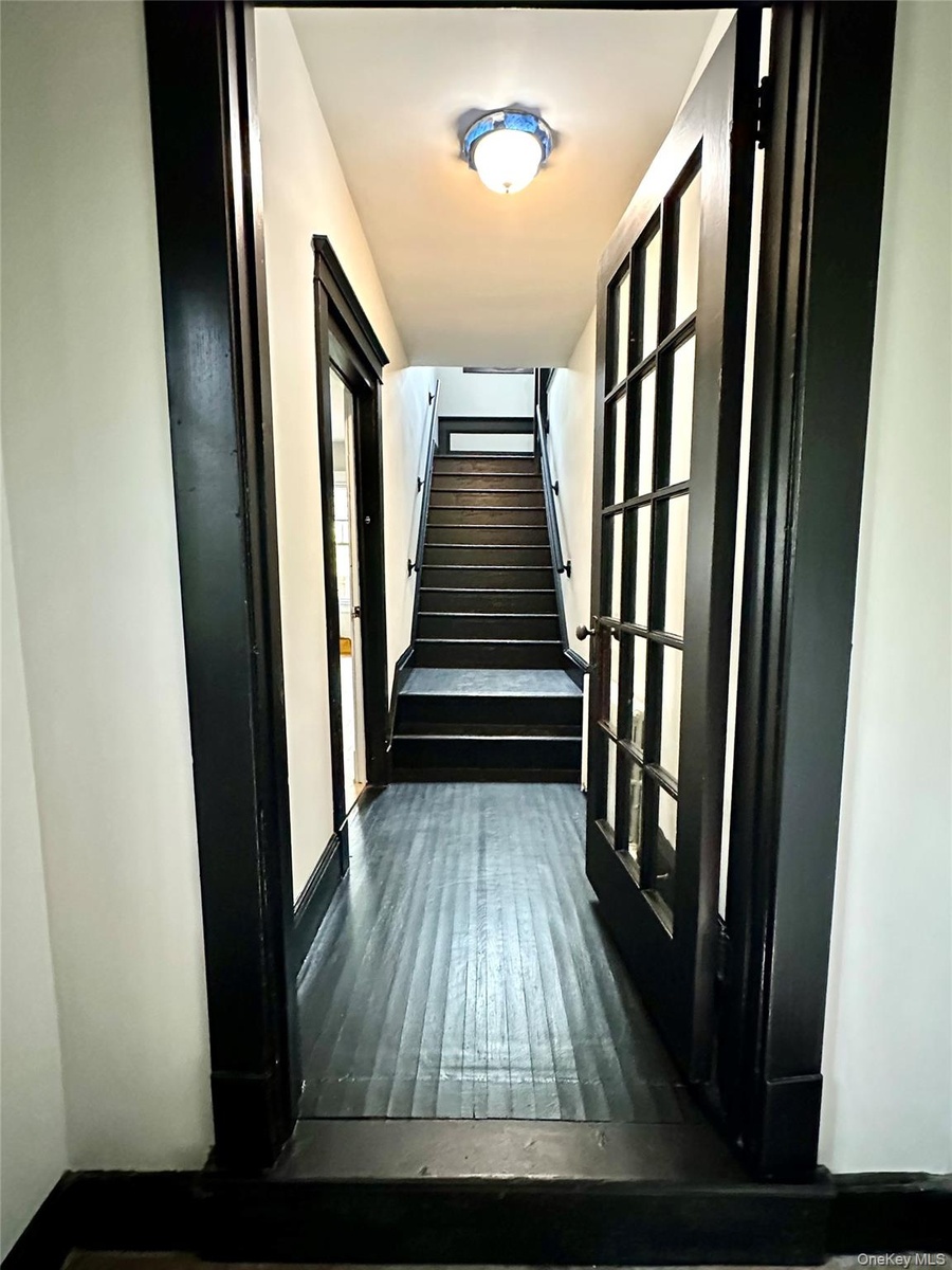 - Corridor featuring stairs and dark wood-style flooring