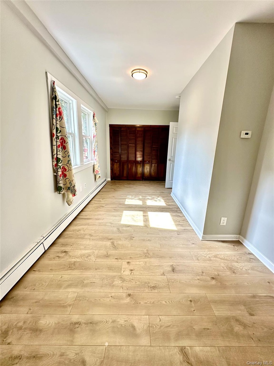 - 2nd floor bedroom #1 with light wood-style flooring, radiator heating unit, and a closet