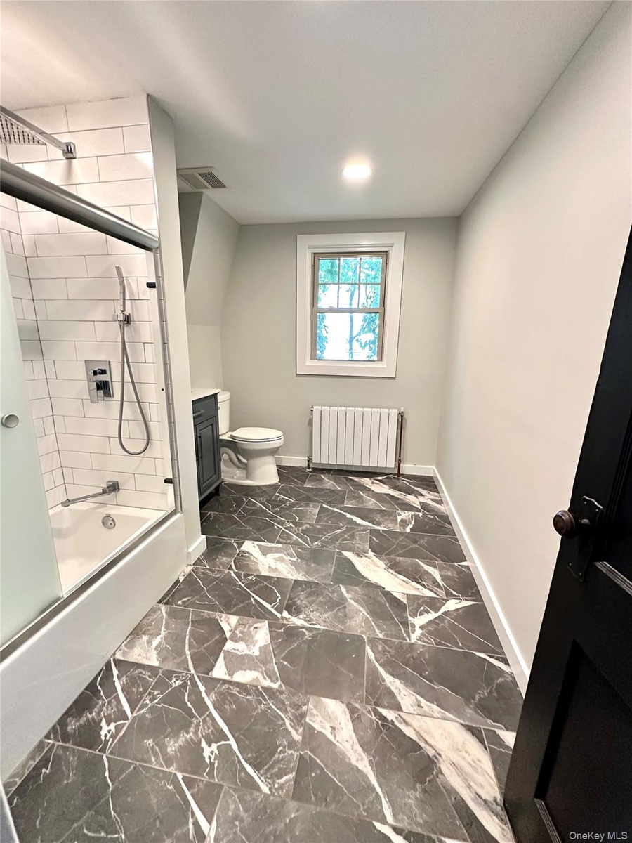 - Full bathroom on the 2nd floor featuring bath / shower combo with glass door, vanity, radiator heating unit, and dark marble finish floors