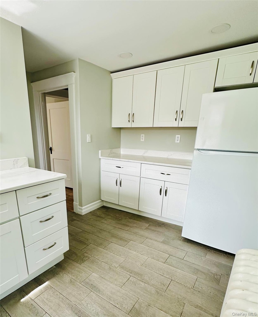 - Kitchenette on the second floor with the fridge and cabinets