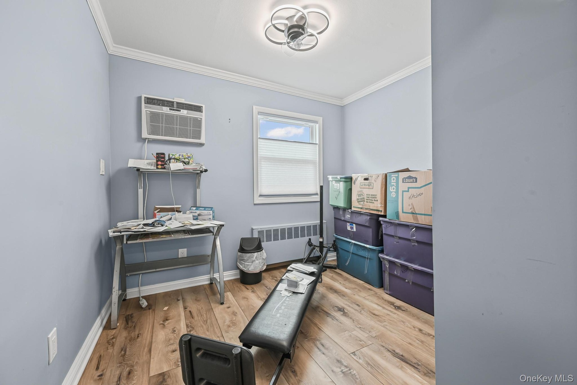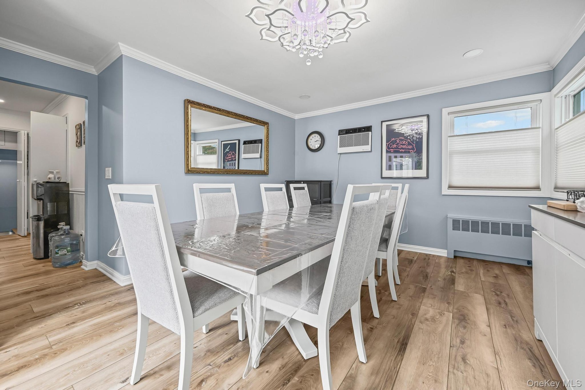 - Dining space featuring radiator, ornamental molding, light wood finished floors, a chandelier, and a wall mounted AC