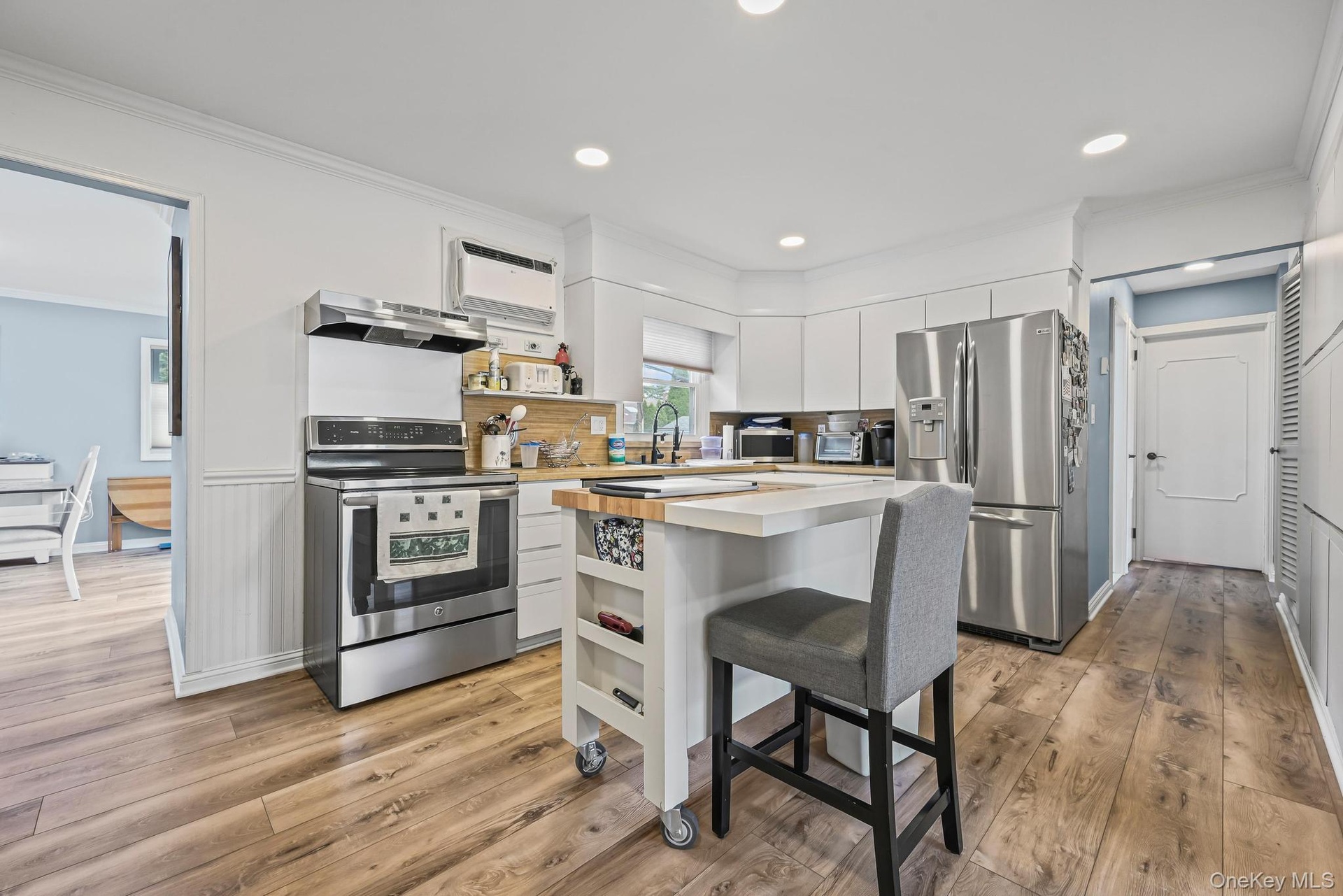 - Kitchen with ornamental molding, white cabinets, a breakfast bar area, open shelves, and stainless steel appliances