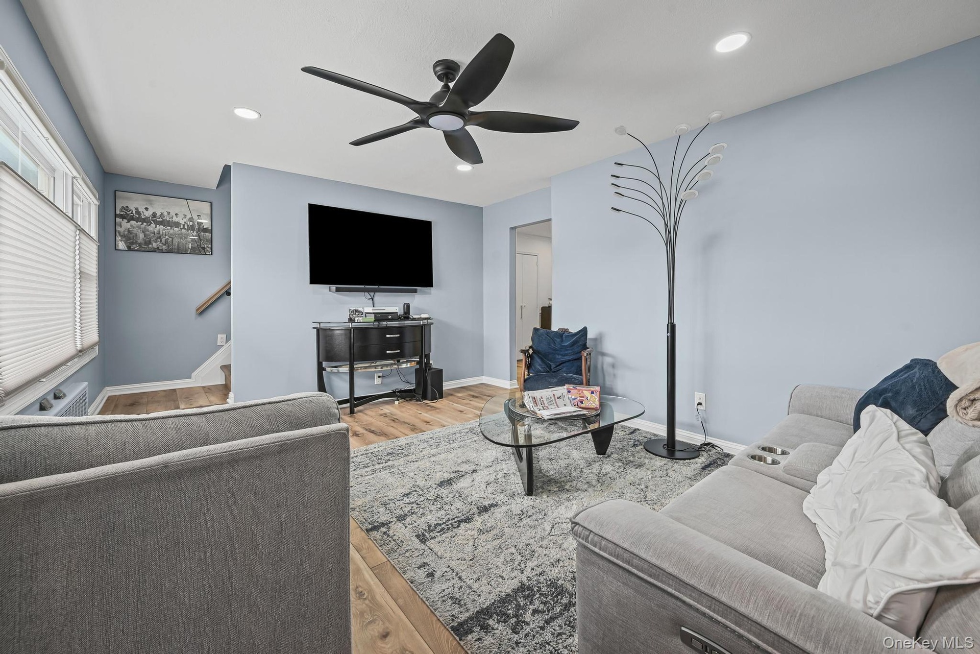 - Living area featuring light wood-style floors, recessed lighting, and a ceiling fan