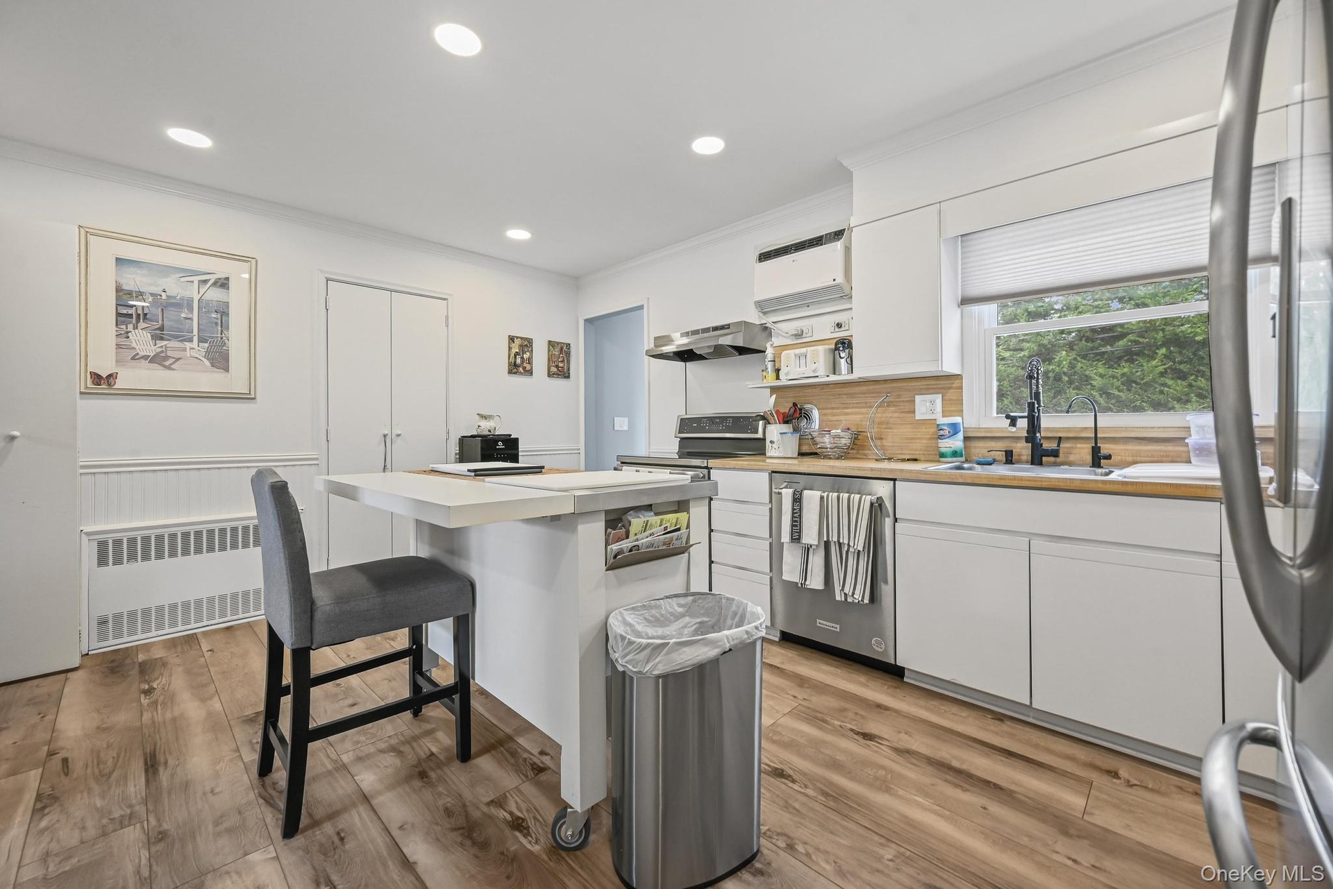 - Kitchen featuring light countertops, a kitchen breakfast bar, white cabinetry, open shelves, and radiator