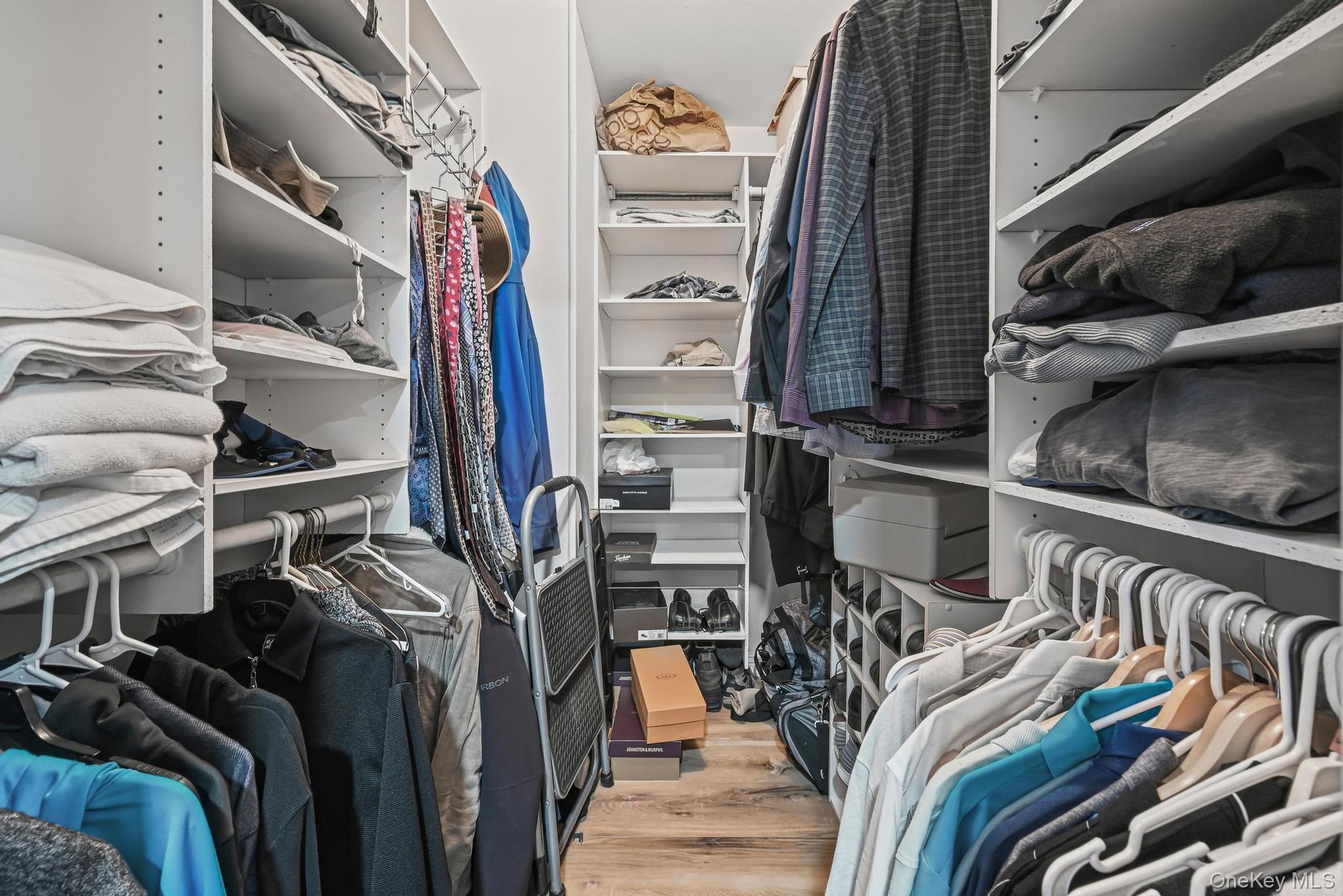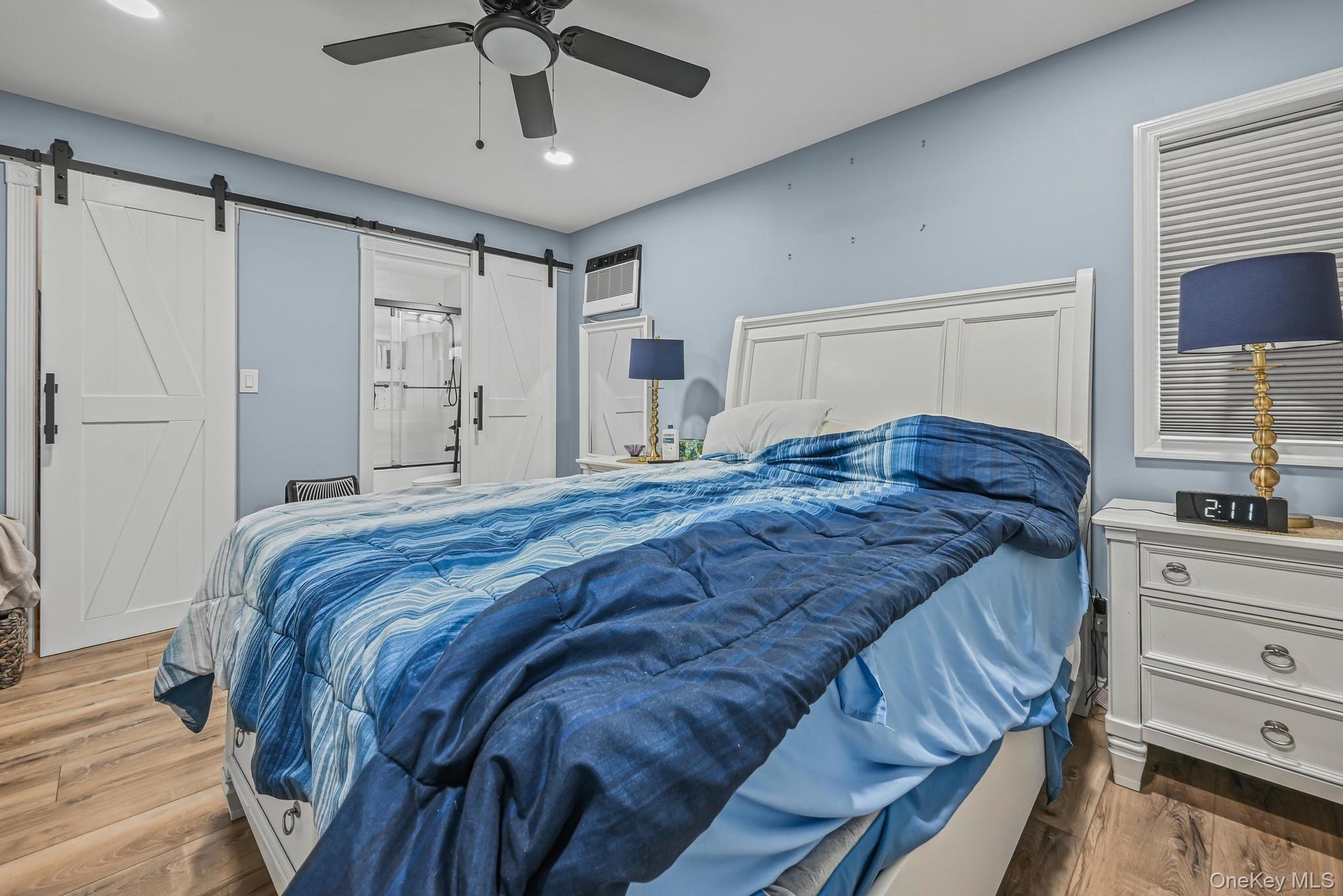 - Bedroom with wood finished floors, connected bathroom, ceiling fan, recessed lighting, and a wall mounted air conditioner