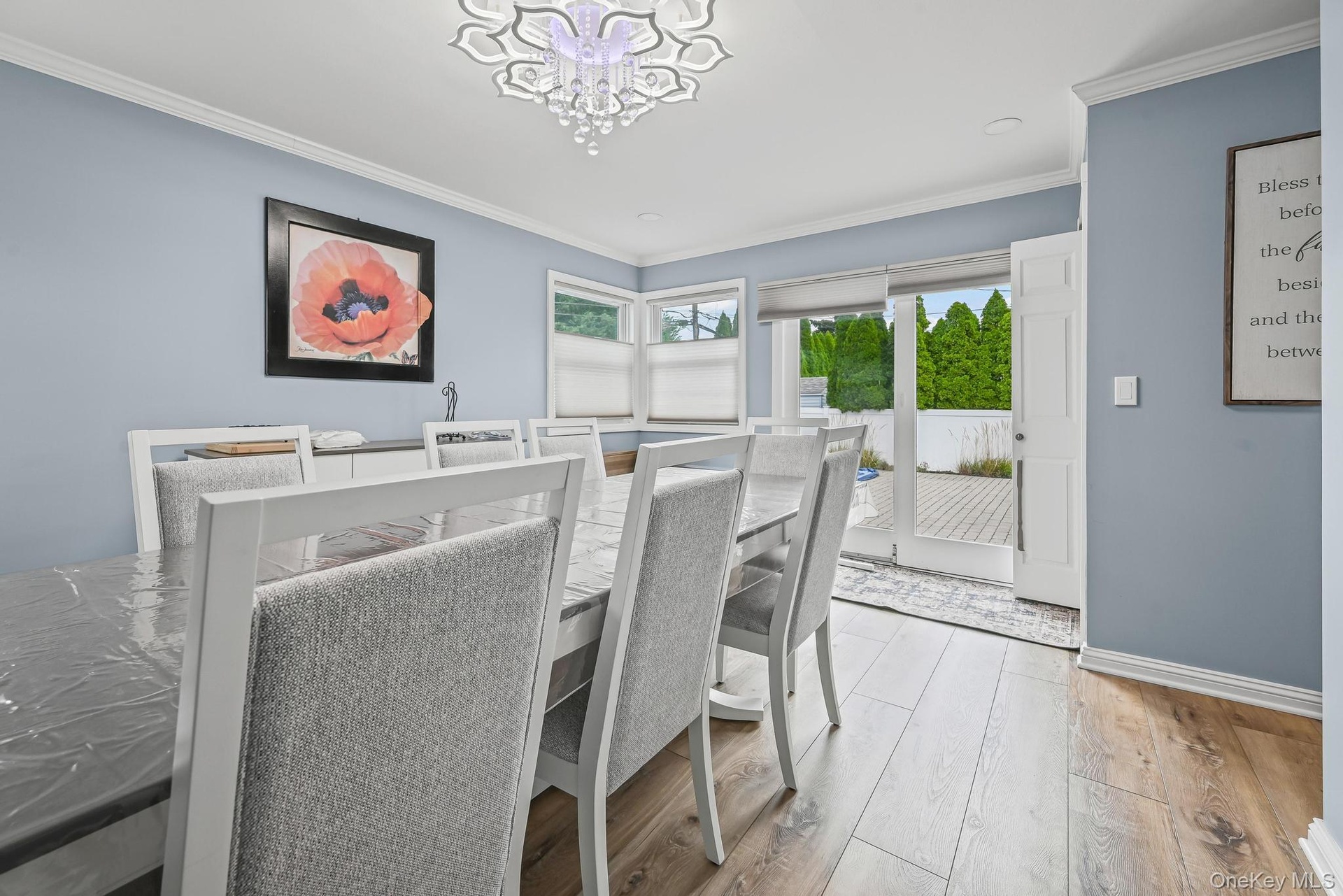 - Dining room featuring a chandelier, light wood-style flooring, and ornamental molding