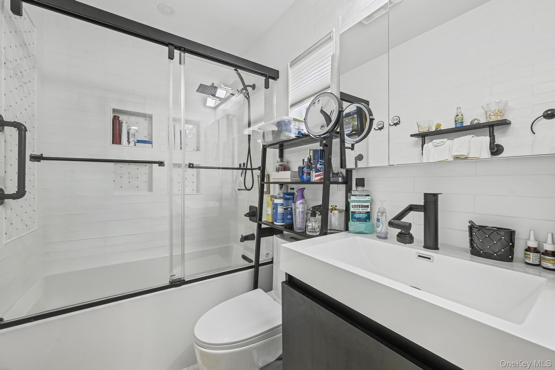 - Full bath with vanity, combined bath / shower with glass door, and backsplash