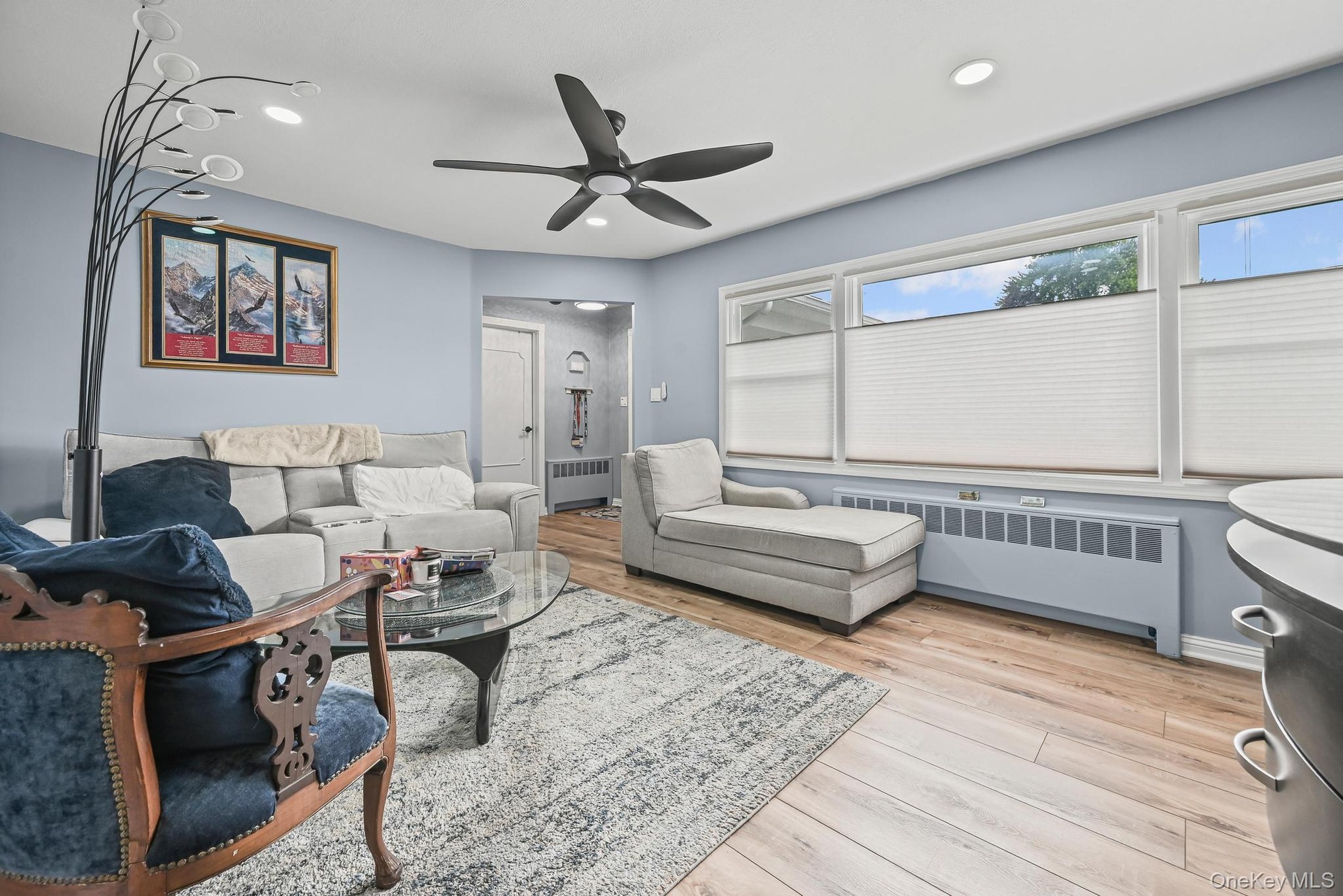 - Living area featuring radiator heating unit, light wood-style floors, recessed lighting, and ceiling fan