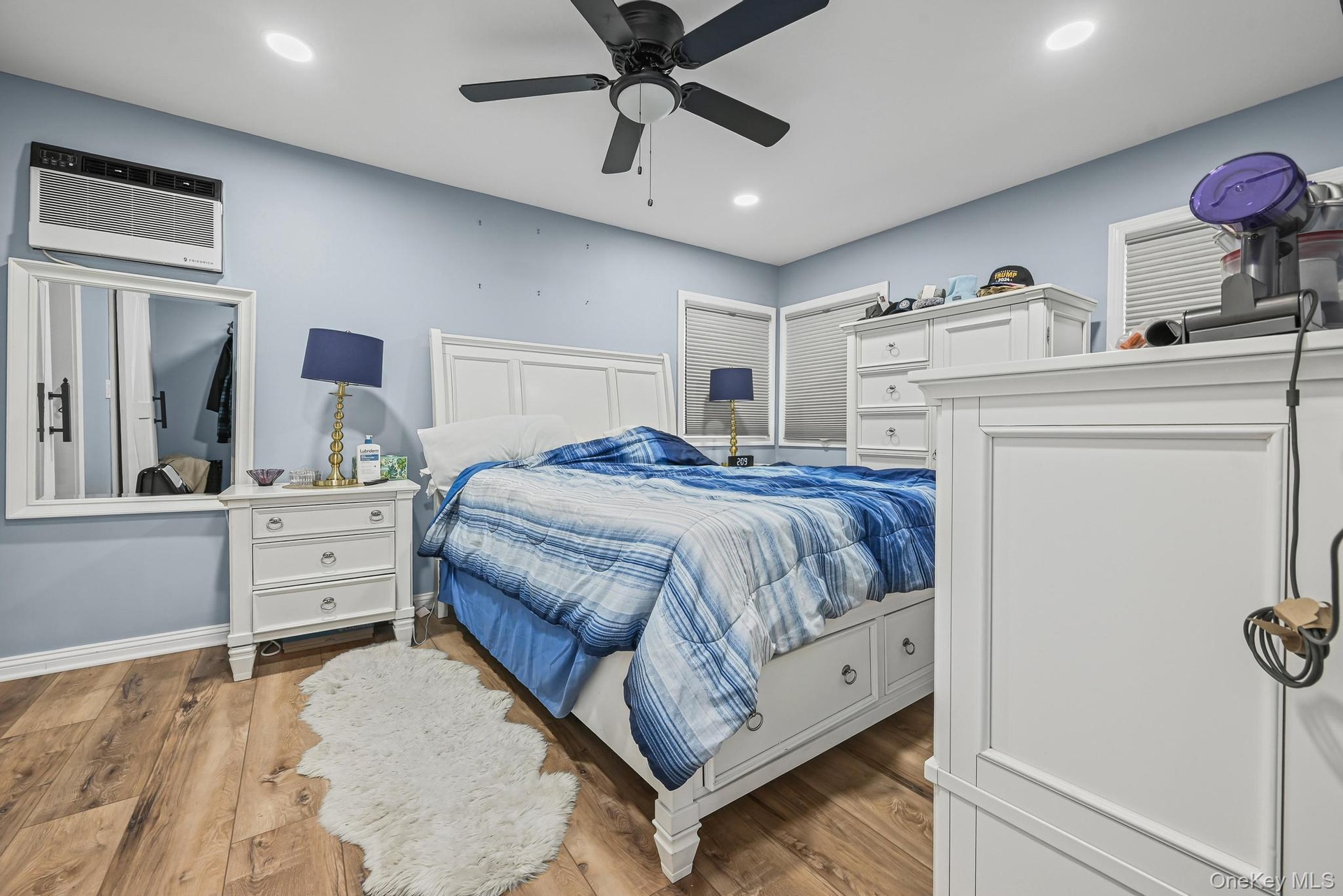 - Bedroom featuring wood finished floors, a wall unit AC, ceiling fan, and recessed lighting