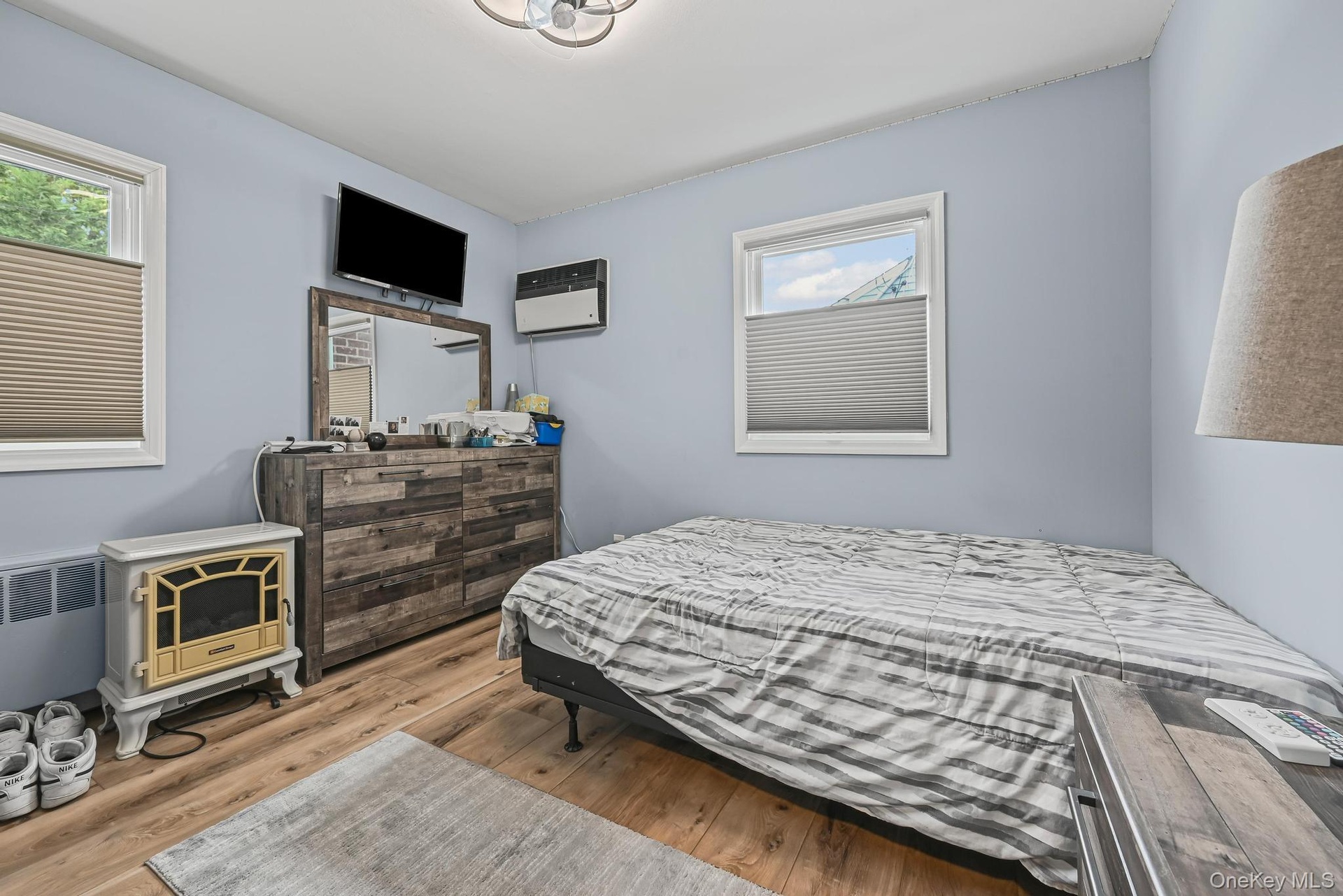 - Bedroom with multiple windows, wood finished floors, and radiator