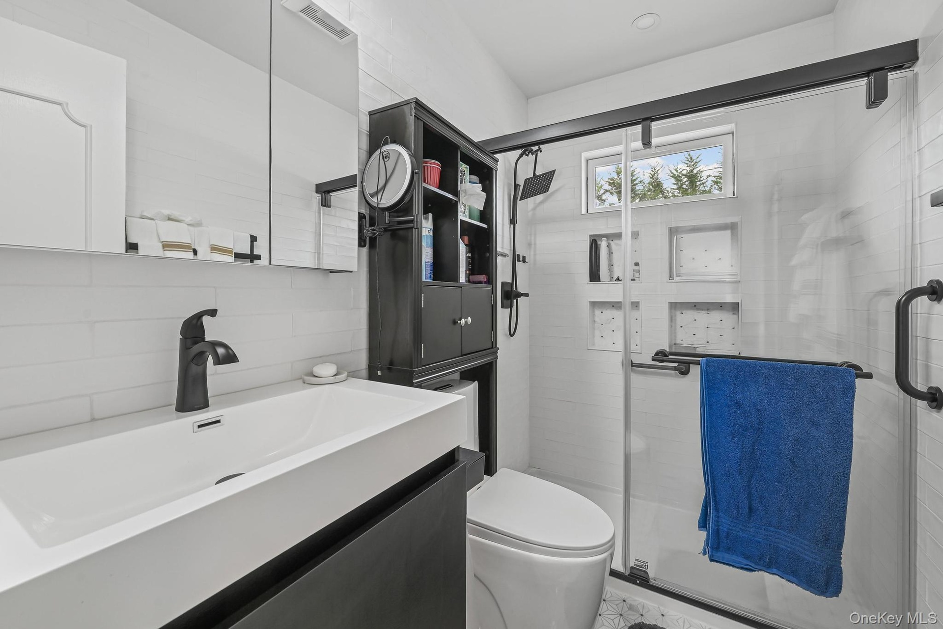 - Full bath featuring vanity, a stall shower, backsplash, and tile walls