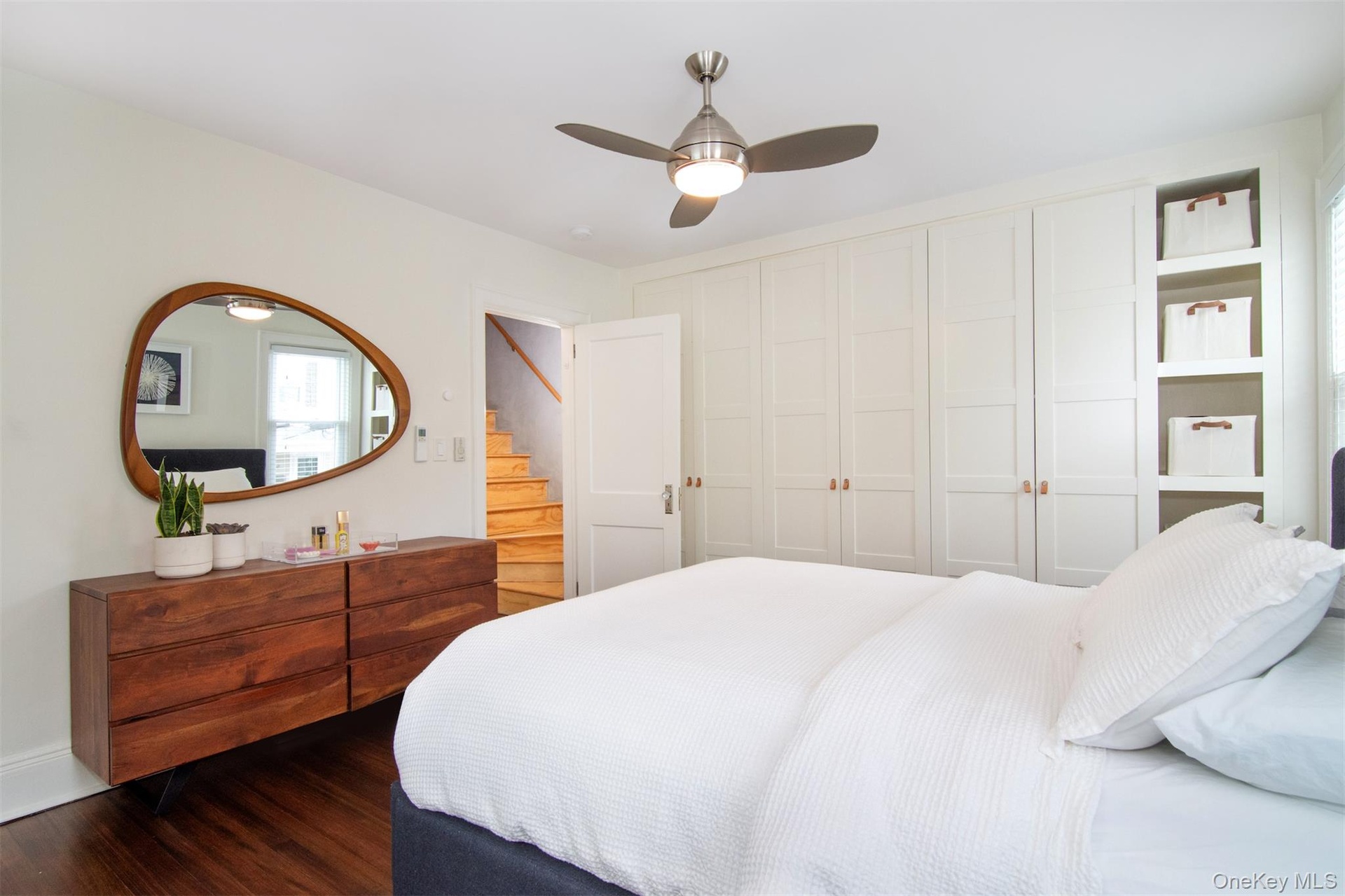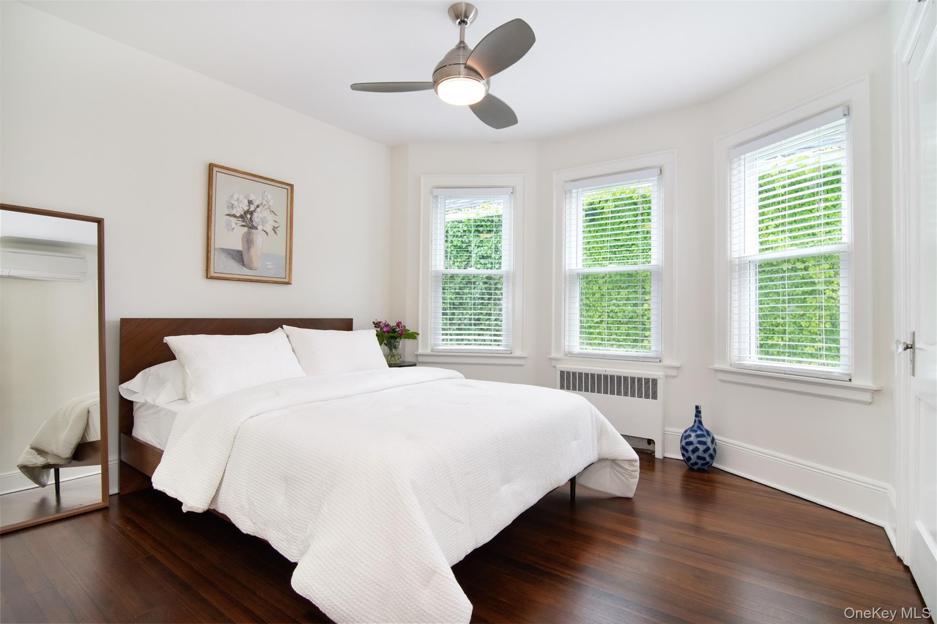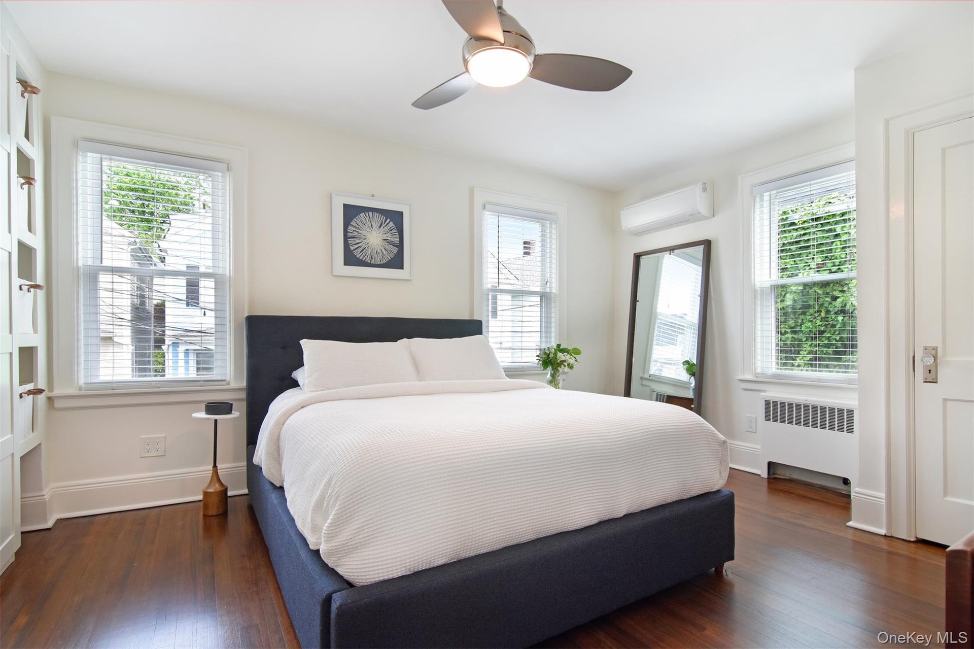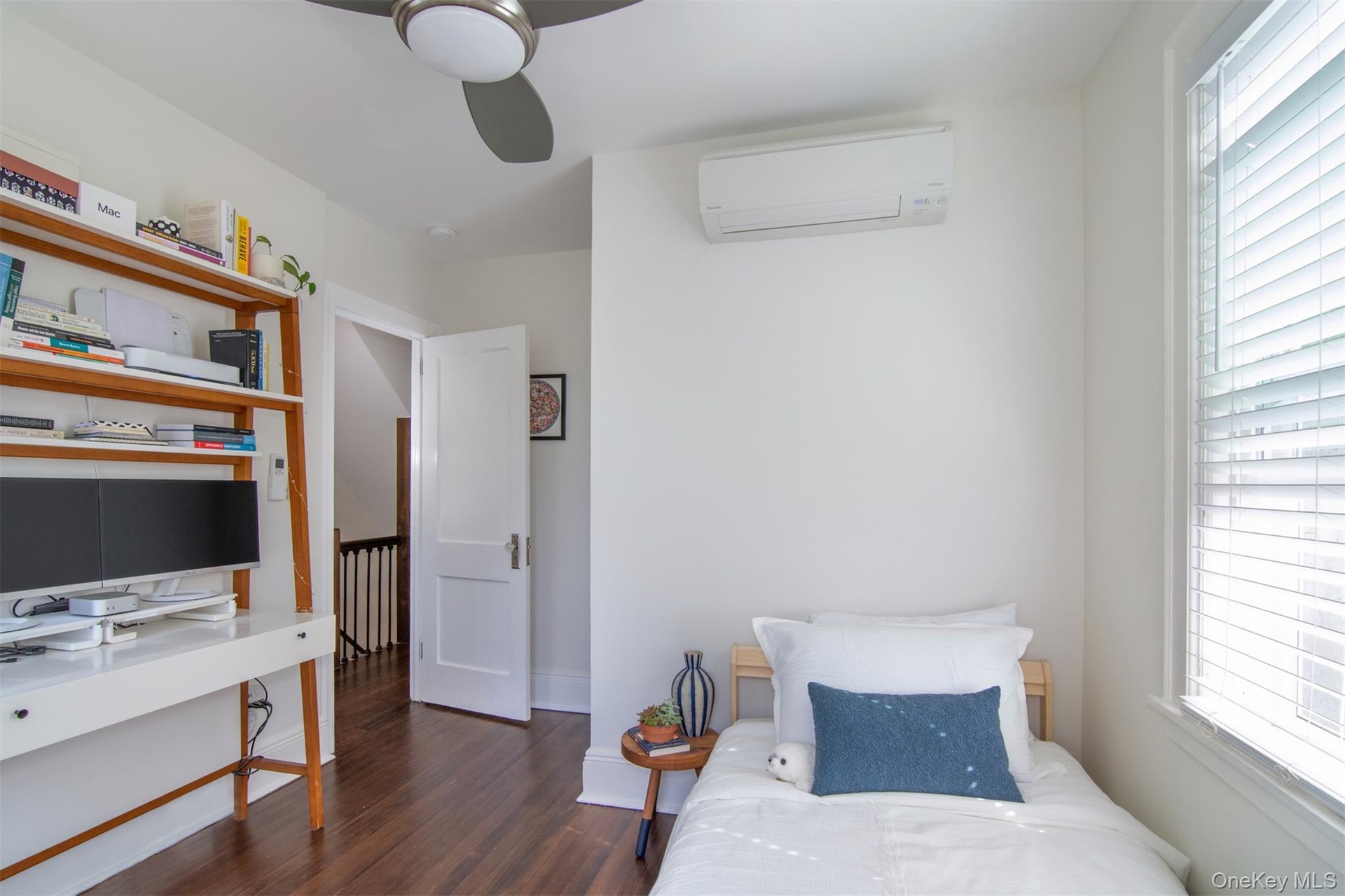 - Bedroom with an office area, a wall mounted air conditioner, dark wood finished floors, and ceiling fan