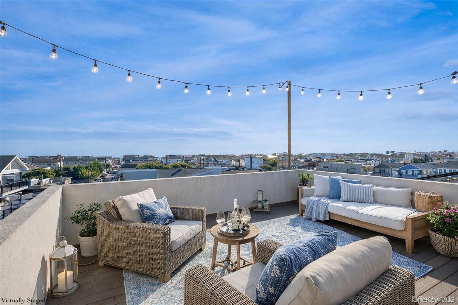The ground level offers versatile living space, including a full bath and walk-out access to the backyard—ideal for guests, a gym, studio, or recreation space. The home is further elevated by features like tankless hot water, 200-amp electric, and roof deck access through a custom skylight stairway, where you’ll take in panoramic views of the Atlantic Ocean, Reynolds Channel, and the NYC skyline.