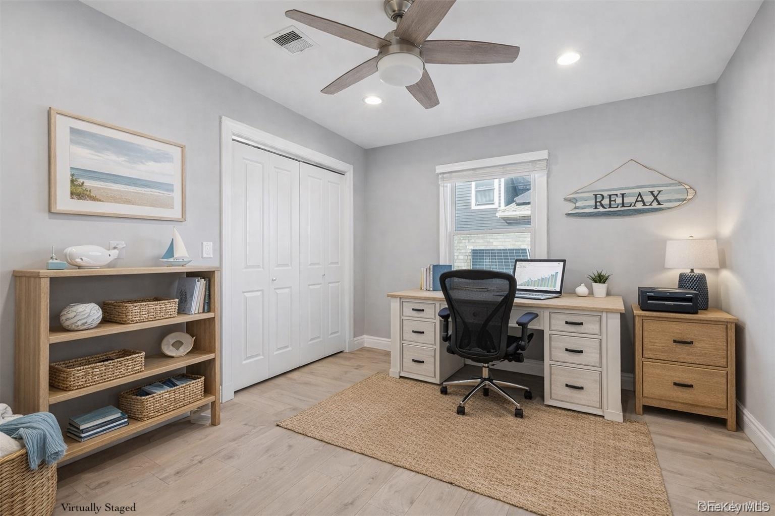 - Bedroom or office area with light wood-style floors and recessed lighting