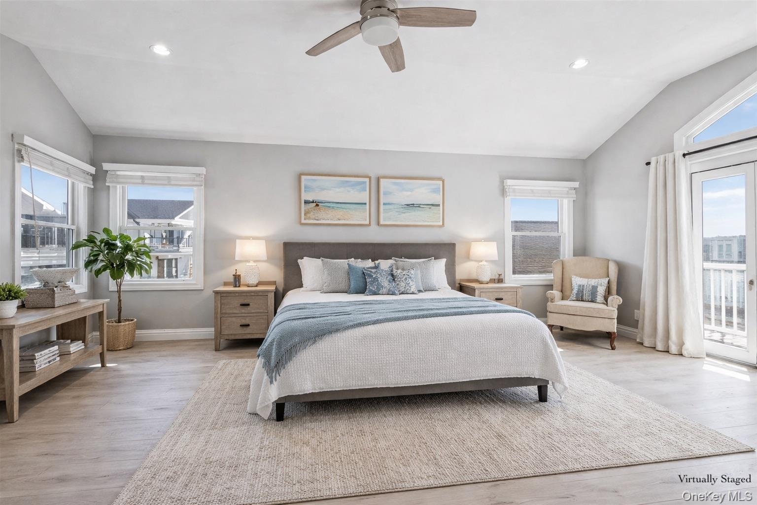 - Bedroom featuring vaulted ceiling, a ceiling fan, light wood-style floors, and recessed lighting with access to 2nd story terrace