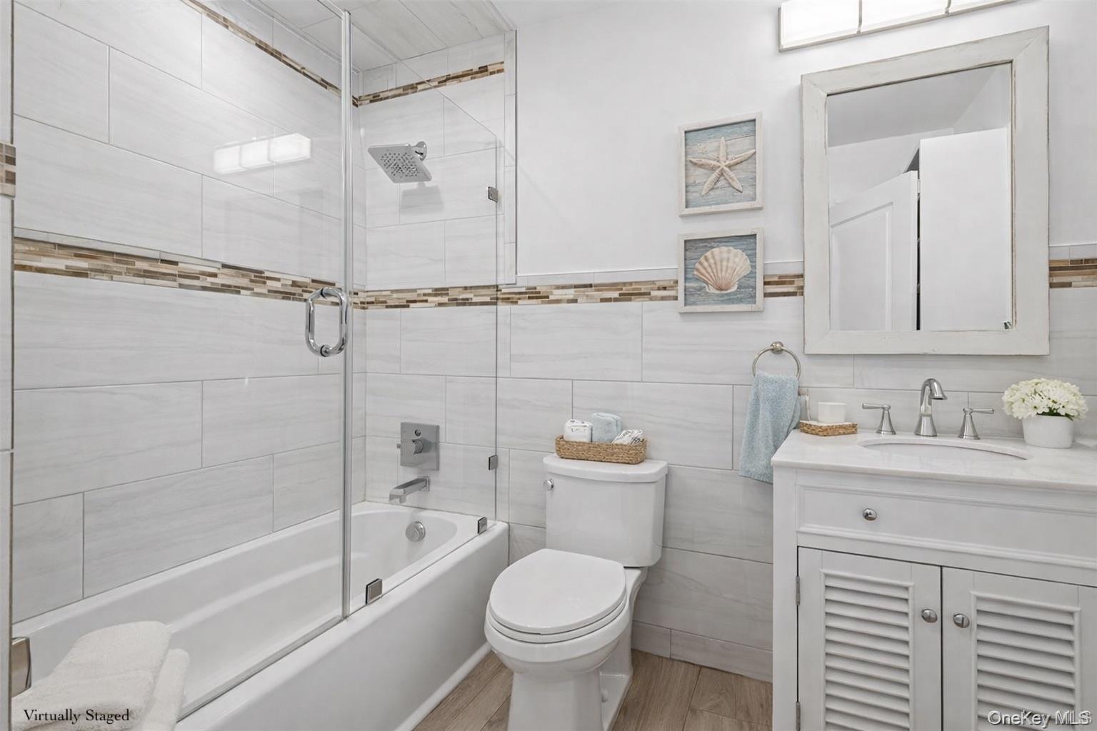 - 2nd Full bathroom featuring combined bath / shower with glass door, vanity, tile walls, and light wood finished floors