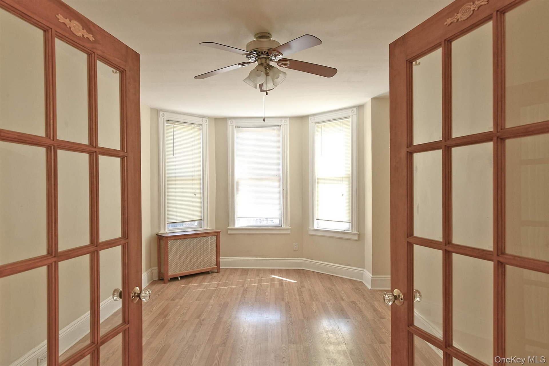 - Unfurnished room featuring light wood-type flooring, a ceiling fan, and french doors