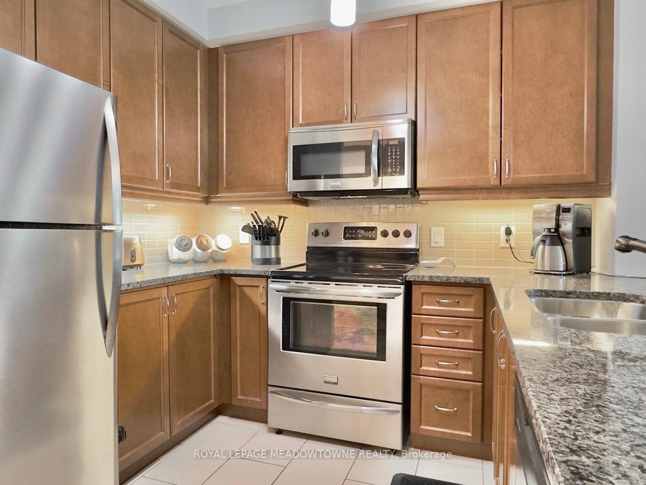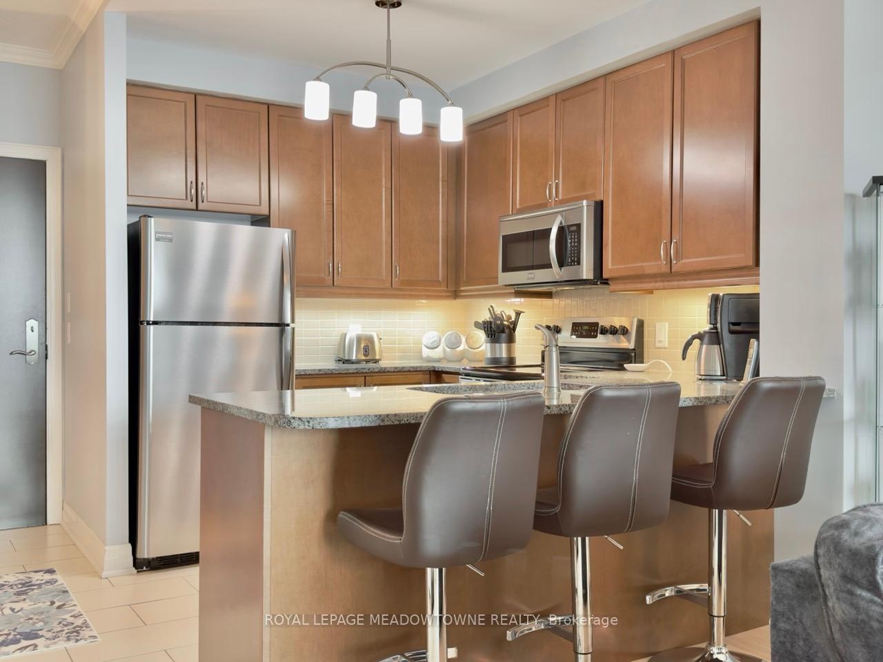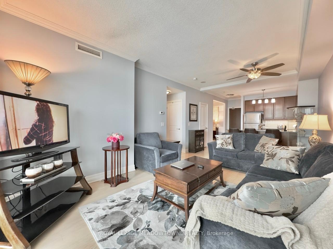 Welcome to this stunning condo unit at 100 John Street #403, ideally situated in the heart of downtown Brampton. This beautifully maintained 743 sq ft (per MPAC) apartment offers modern living with a highly functional layout and impressive features throughout. The open-concept living/dining space is bathed in natural light from floor-to-ceiling windows, showcasing spectacular southeast views. Premium finishes include elegant 9-foot ceilings accented with crown molding throughout. The living area flows seamlessly to a generous balcony - perfect for outdoor enjoyment and unobstructed south easterly views. The contemporary kitchen features granite countertops, sleek stainless steel appliances, tile backsplash, and a convenient breakfast bar for casual dining. The spacious primary bedroom offers ample space, large windows with eastern exposure, and a walk-in closet with built-in organizers. A versatile den provides the perfect setup for a home office or guest room. Complete with a spacious 4-piece bathroom, vanity and built-in storage solutions. This well-managed building offers excellent amenities including 24-hour concierge, fully equipped fitness center, theatre room, party/meeting room, guest suites, wine storage, and rooftop terrace. The prime downtown location puts you steps from GO Transit station, Farmers' Market, Rose Theatre, YMCA, Gage Park, Public Library, Etobicoke Creek Trail system, diverse dining options, and professional services. Enjoy seasonal community events & festivals right outside your door. Additional features include owned parking (Level B #12) and owned locker (Level B #133). This turnkey unit is ideal for first-time buyers, professionals, or downsizers seeking convenient urban living with all amenities at your doorstep.