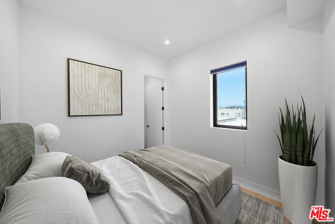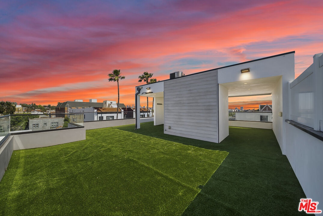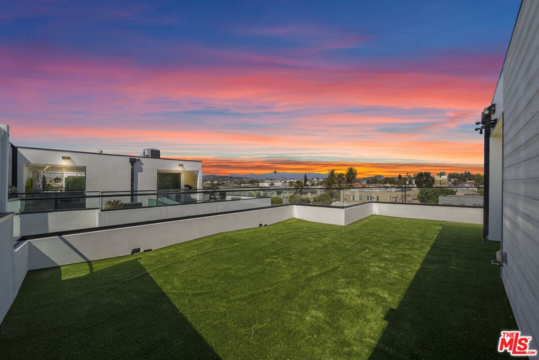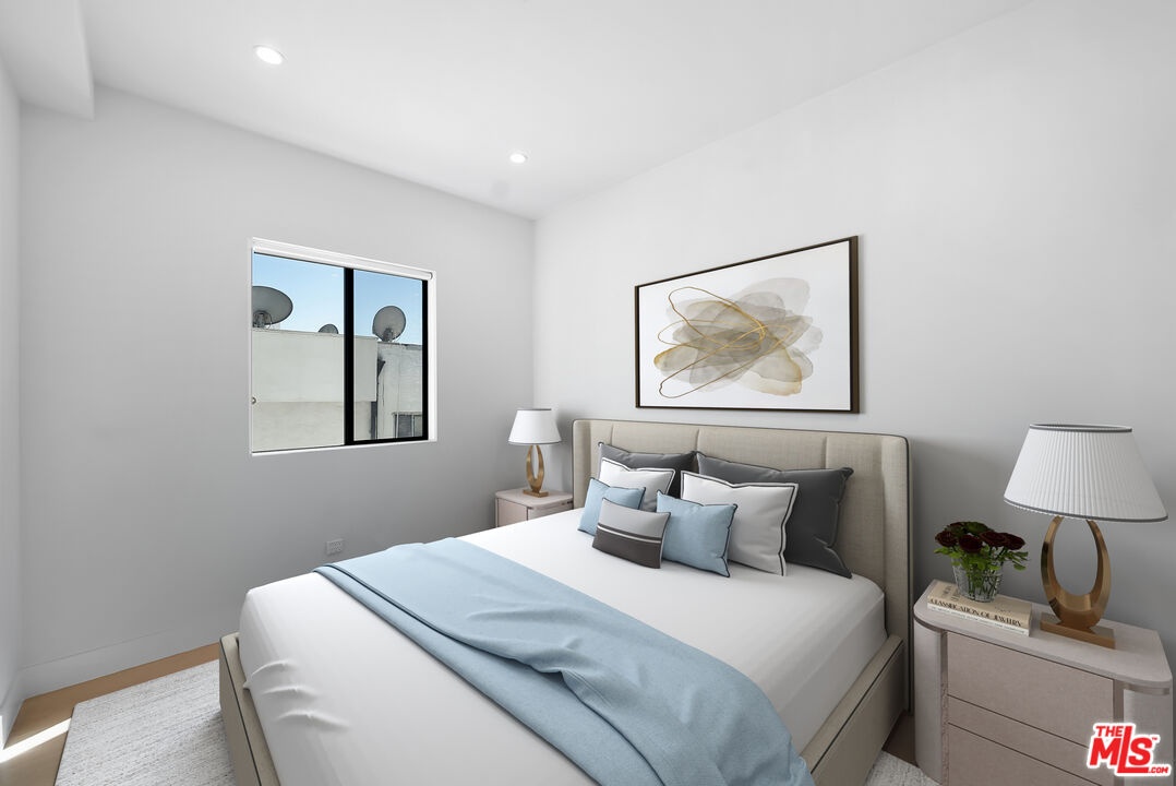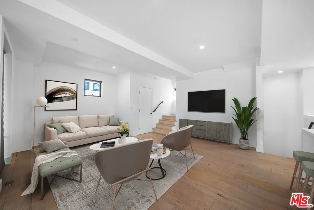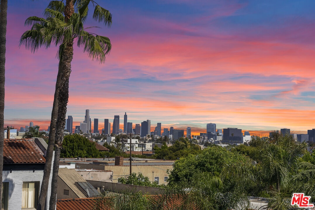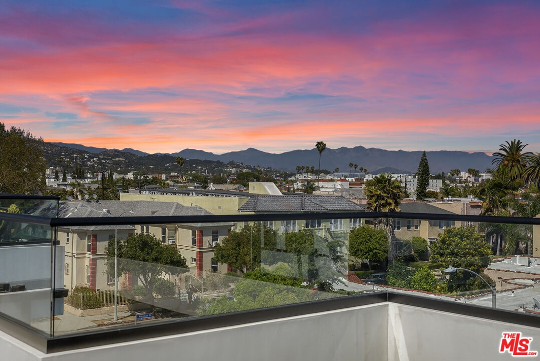 PRICE REDUCED! Newer Construction 3BR/4BA Corner Unit with Rooftop Deck + Iconic Views! Modern home located in the heart of Hollywood's Studio District. Built in 2018, this spacious home features an open-concept floor plan with natural hardwood floors, recessed lighting, and abundant natural light. The main level includes a versatile bedroom/office, powder room, and direct access to a private 2-car garage.The second level opens to a large great room and chef's kitchen with quartz center island, stainless steel appliances, gas range, and built-in ceiling speakers. Three additional en-suite bedrooms are located on the upper levels, each with generous closet space and updated bathrooms. Smart home features include app/voice-controlled lighting, in-ceiling speaker system with 4 zones and individual amp controls, MyQ smart garage access, and security cameras at all entry points. The private rooftop deck offers wrap-around VIEWS of the Hollywood Sign and Downtown LA, complete with a built-in BBQ and multiple seating areas. Two guest parking spaces included. Prime location near Netflix HQ, Paramount, Sunset Gower, Raleigh Studios, and Larchmont Village.