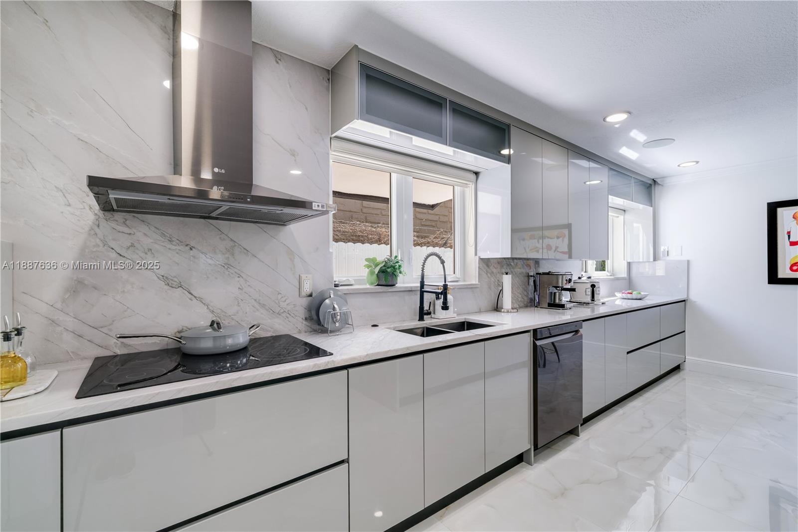 Fabulous home impeccably designed & ideal for entertaining. Fall in love with the vaulted ceilings, surrounded by windows with views of the beautiful pool & gardens. Open concept layout, 3,095 SF ample living spaces & elegant high-end finishes. Spacious NEW kitchen features a large island, custom cabinets, SS appliances, granite counters & wine cooler. 2/2 split floor plan downstairs with luxurious master suite, rain shower & double built-out walk-in closets. 2 large beds & 1 bath upstairs. Home features impact glass, electric & Bahama blinds, recessed lights, alarm, 2 car garage... Enjoy a beautiful pool patio, trellised outdoor dining & kitchen, with cabana bath. Boat space with electronic access door. This hidden gem sits on 12,212 SF in a cul-de-sac & located just off the Turnpike.