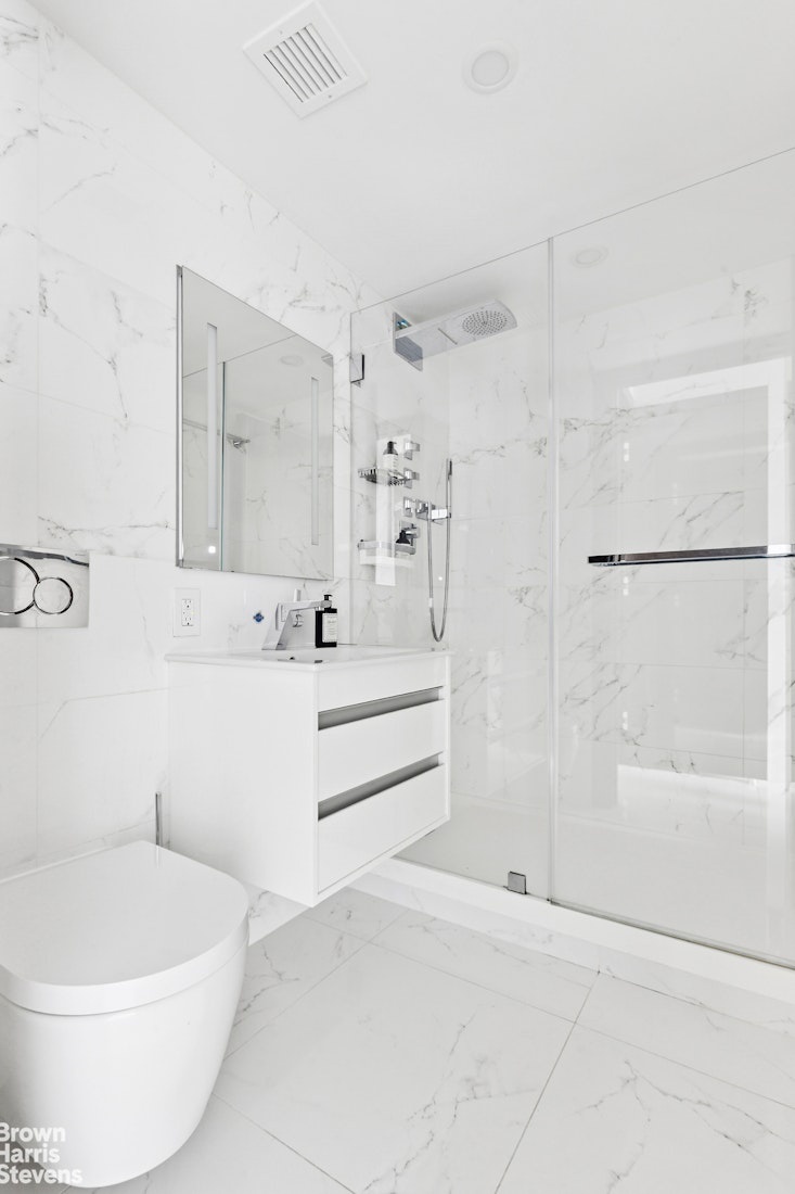 The bathrooms are true sanctuaries, clad floor-to-ceiling in Porcelanosa Carrera porcelain. Every fixture has been carefully selected from the finest European brands. Dornbracht faucets and showers provide precision craftsmanship, while Hansgrohe fixtures add both design and performance. Wall-mounted Duravit vanities and toilets, paired with sleek Geberit systems, maximize space and modern appeal. Robern LED medicine cabinets introduce functional elegance with soft, flattering light, and custom glass shower doors complete the spa-like environment. There is an additional half bath for your guests! Each detail-from the flush finishes to the subtle textures-creates a retreat where luxury meets tranquility.