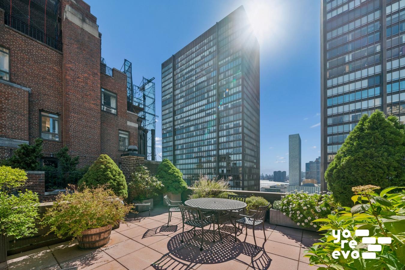 10 Mitchell Place is a full-service co-op built in 1928 with a 24-hour doorman, live-in super, laundry room, bike room, storage and mail delivery to your door. The buildings landscaped roof terrace is one of the best in the city and offers panoramic views of the East River and the Empire State Building, a setting so striking it was frequented by Henri Matisse.