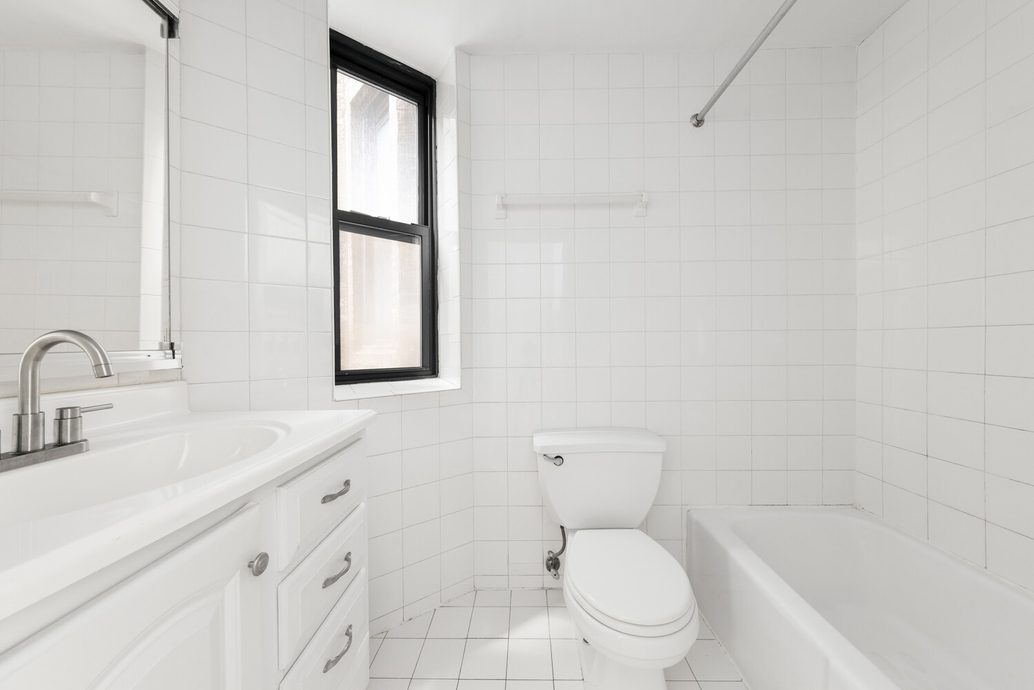 The serene and cozy bedroom can fit a queen size bed and offers a generous closet. The windowed bathroom features a shower/tub and stainless-steel fixtures all clad in white tiles.