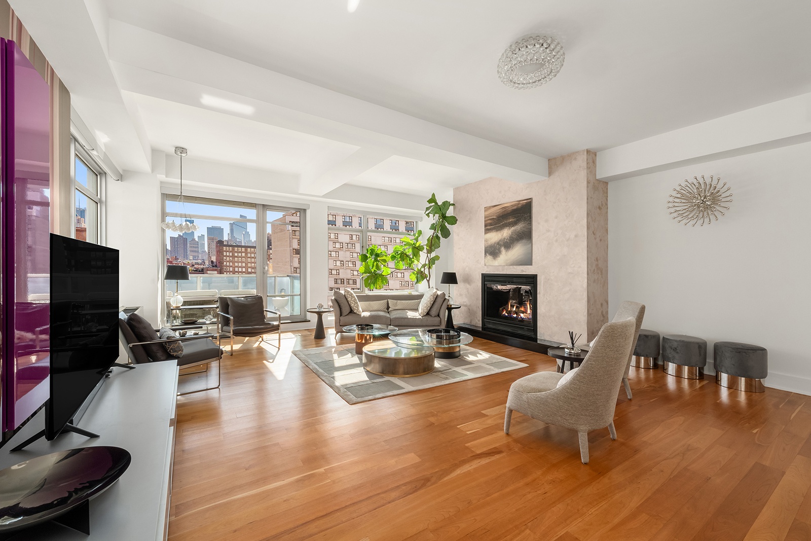 The airy primary suite boasts a private terrace with south and west exposures, as well as a windowed ensuite bathroom with an oversized shower, deep soaking bathtub, dual vanities and marble flooring. Two more generously sized bedrooms feature large closets and sun-filled city views from expansive north-facing windows. A discreetly placed W/D services the bedrooms, rounding out the private quarters.