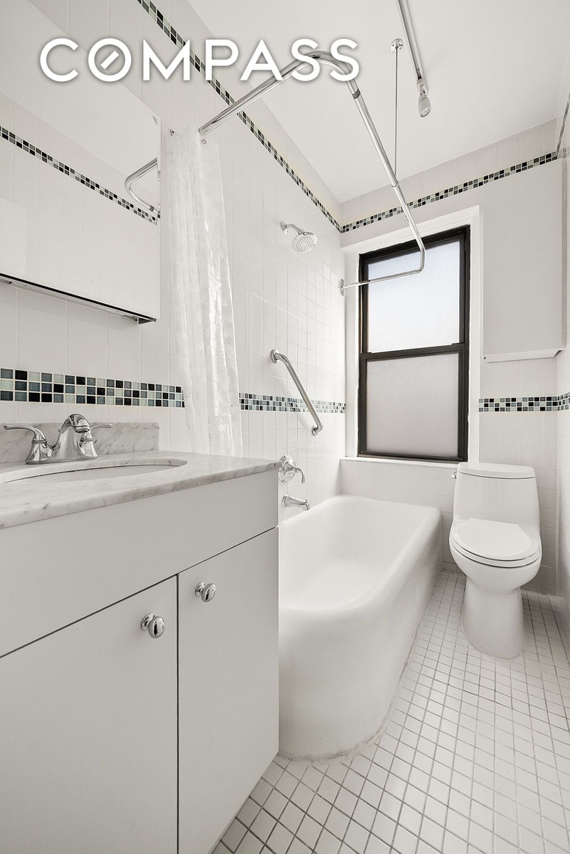 The apartment features 9-foot ceilings, original hardwood floors, and oversized windows that flood the space with natural light. A gallery entry opens to an oversized foyer flanked by two closets, creating the perfect space for a large office area. Ahead, the living room stretches 23 feet long to accommodate comfortable seating and dining areas. The eat-in kitchen, with a sunny breakfast area perfect for morning coffee, connects with a large pantry. Stainless steel appliances, including a vented gas range and dishwasher, make cooking and cleaning a breeze.