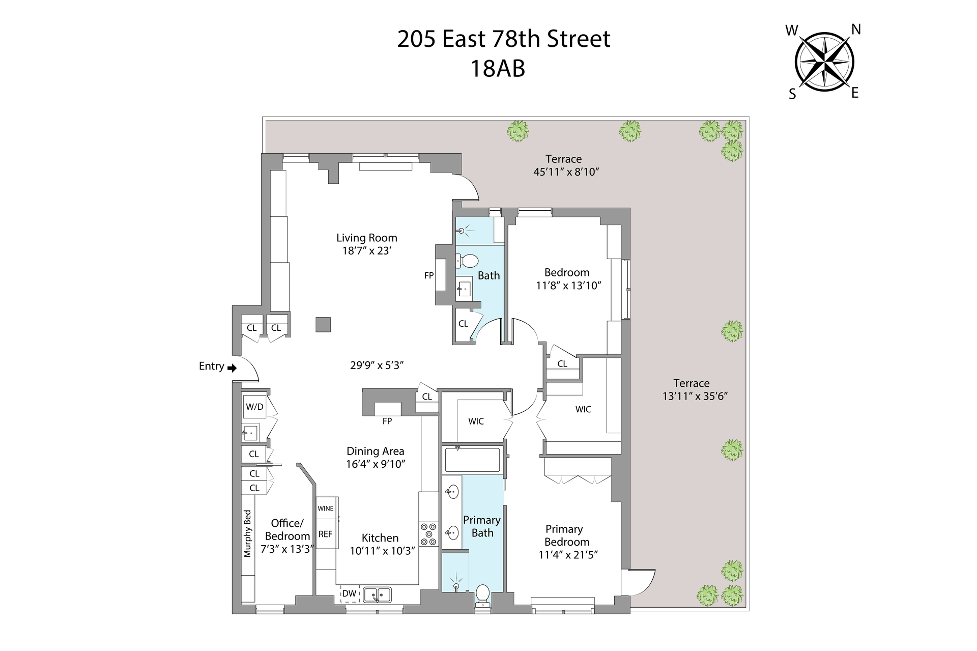 A seamless blend of indoor-outdoor living, panoramic views, and impeccable design, this is the trophy terrace home you've been waiting for. Perched high above the Upper East Side, this extraordinary residence offers a private wrap outdoor space, stunning sunsets, and a rare triple exposure. Following a complete gut renovation that combined the A and B lines, the home now offers an ideal, flowing layout, modern infrastructure including upgraded electrical, and an added washer/dryer, all completed with the highest level of craftsmanship. Living Room: - Custom built-ins by Little Wolf Cabinets maximize style and storage. - A working wood-burning fireplace anchors the elegant, sun-drenched living space. - Sweeping northwest exposures capture breathtaking sunsets and city views. - Outdoor space is directly accessible from the living area, creating an effortless indoor-outdoor flow for daily living and entertaining. Kitchen: - Fully upgraded chef’s kitchen featuring Bertazzoni stove, Sub-Zero refrigerator and wine fridge, Viking microwave, and Miele dishwasher. - Smallbone windowed cabinetry design with a double sink elevates both form and function. - A rare second wood-burning fireplace adds warmth and intimacy, perfect for hosting unforgettable dinner parties. Bedrooms: - The serene primary suite opens directly onto the terrace, offering a private retreat with city skyline views. - A luxurious five-fixture primary bathroom brings spa-like comfort to everyday life. - The spacious secondary bedroom features a reach-in closet and bespoke built-ins by Little Wolf Cabinets for smart storage. Office: - A sun-filled, windowed office (or optional third bedroom) is enhanced by a built-in Murphy bed, offering incredible versatility for work or guests. 205 East 78th Street is a classic prewar cooperative known for its Art Deco charm, full-service staff, and impeccably maintained interiors. Amenities include a 24-hour doorman, live-in superintendent, laundry room, bike room, and rentable private storage. Building highlights include: - Maintenance includes all utilities. - Subletting allowed (up to two years total, with one-year renewals). - Pied-à-terre, co-purchasing, and guarantors welcome. - Assessment of $1.65 per share in place through December 2025. - 2% flip tax (or $20 per share, whichever is greater). - 75% financing permitted. Located in the heart of the Upper East Side, moments from Central Park, the Metropolitan Museum, Madison Avenue shopping, and major transportation, this is a home that elevates every aspect of daily life.