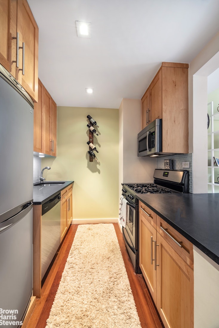 The open kitchen features stainless steel appliances, while the bathroom offers a BioBidet, wall-mounted towel warmer, and an in-unit washer and dryer.