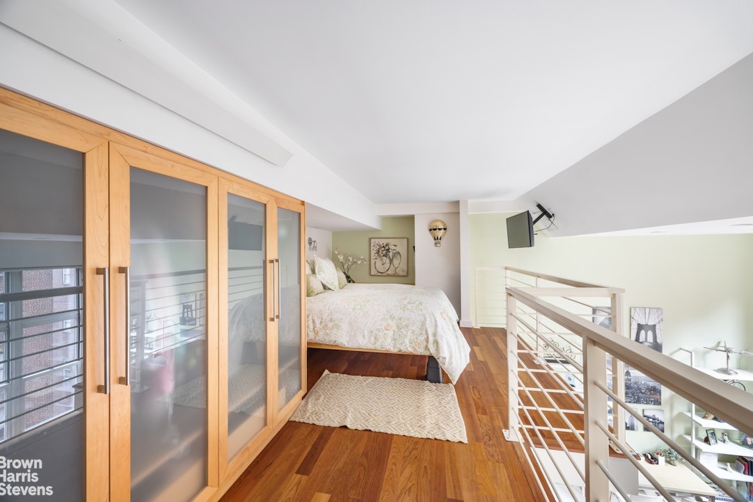 A dramatic duplex one-bedroom home with double-height ceilings and enormous south-facing windows, providing wonderful light.