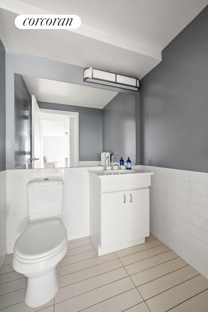 The renovated bathroom features contemporary fixtures, while the half bath offers the potential to be converted into a full second bath. This green building includes cost-saving features such as triple-glazed windows and unitized venting systems, creating a quiet environment while reducing electricity and heating costs. Additional highlights include a Bosch washer/dryer, through-the-wall air conditioning, and excellent closet space.