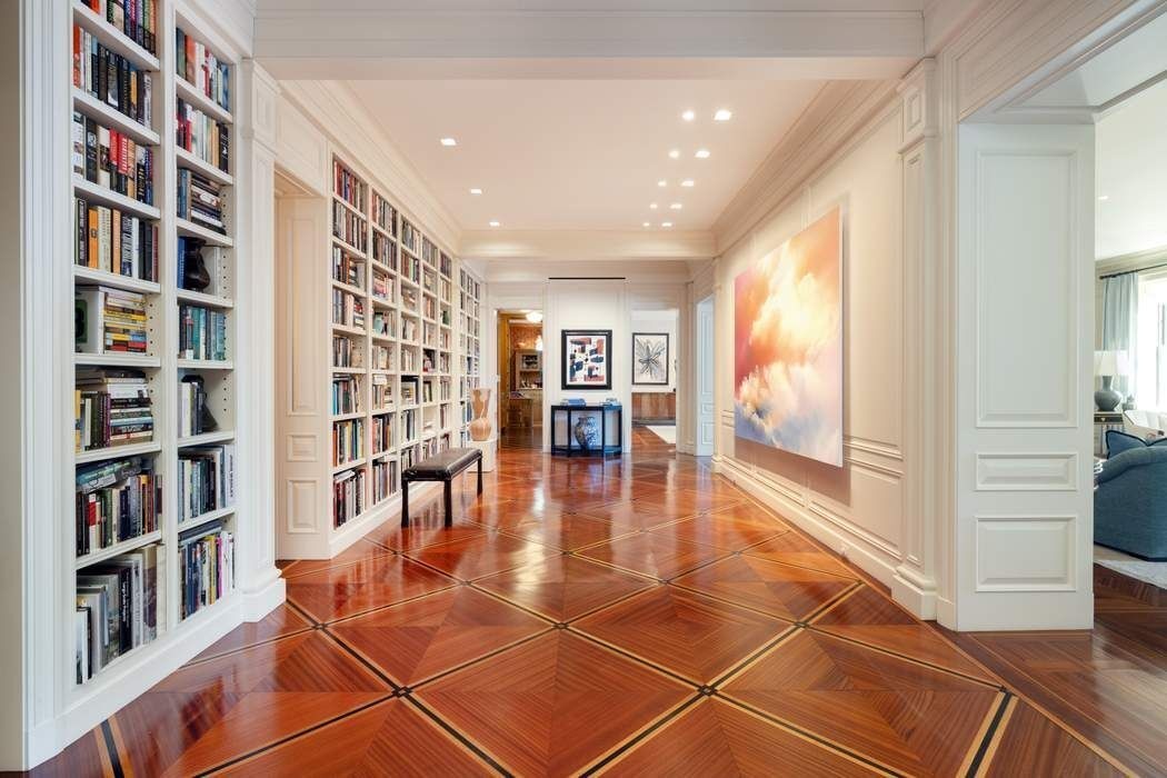 A private elevator landing opens into a stately Gallery, distinguished by custom-built bookshelves, soaring ceilings, and exquisite herringbone-patterned hardwood floors with intricate inlaid geometric detailing. This central axis sets the tone for gracious living and entertaining, flowing seamlessly into an enfilade of grandly scaled, Park Avenue-facing public rooms.